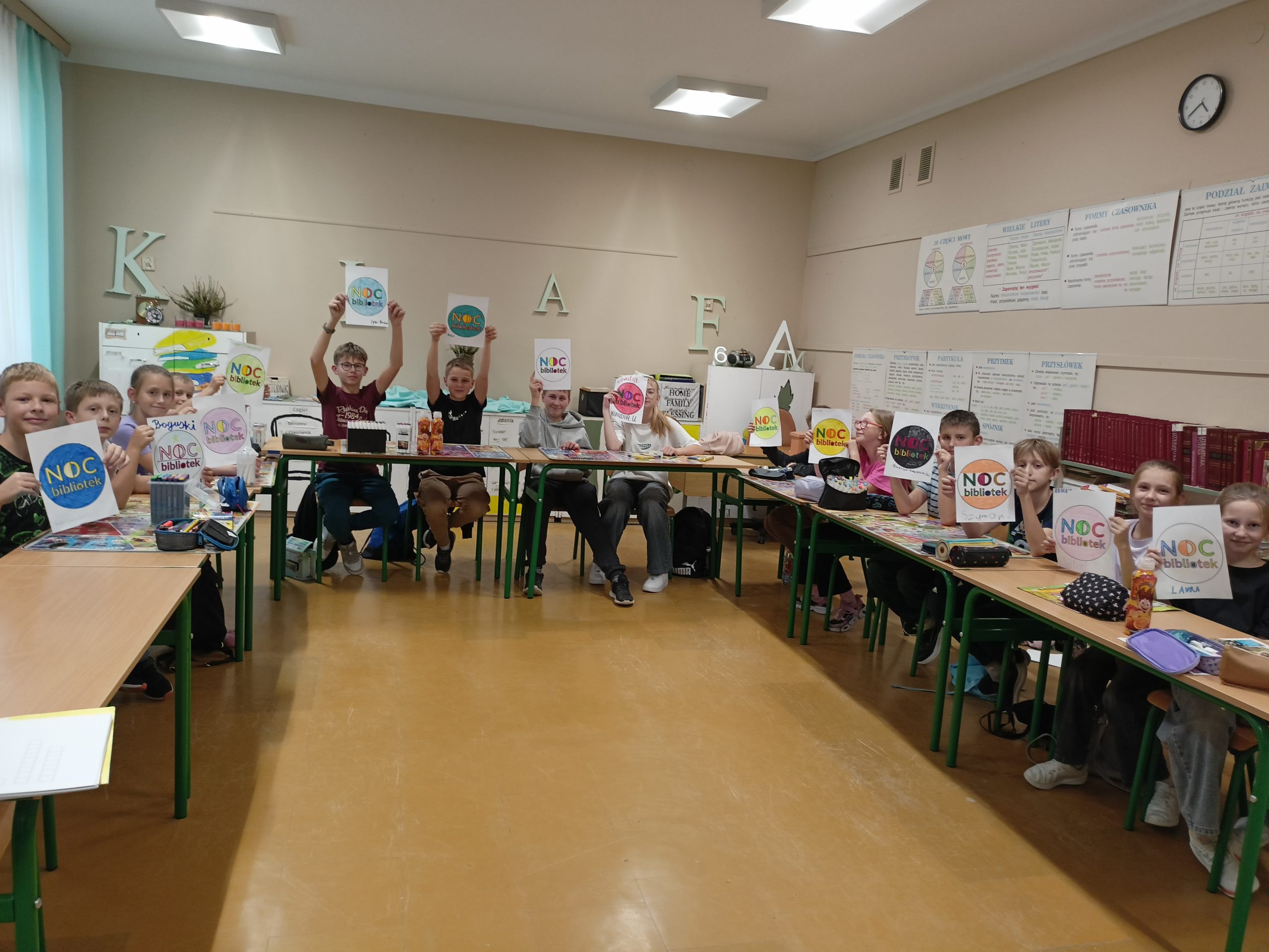 Impreza rozpoczęła się o godzinie 16.00 odczytaniem wiersza, pt. "Jest taki portal" Joanny Mueller. Po przeczytaniu wiersza pierwszym zadaniem było odszukanie liter ukrytych w bibliotece i ułożenie z nich hasła Nocy Bibliotek - "Do dzieła!". Potem przyszedł czas na kolorowanie loga Nocy Bibliotek. Dalszej zabawie towarzyszyło odszyfrowywanie kryptogramów z tytułami książek, krzyżówka oraz zabawy ruchowe. Po intensywnych zadaniach przyszła pora na chwilę wytchnienia i słodki poczęstunek. Następnie uczestnicy mogli spróbować swoich sił w grach planszowych. Finałową atrakcją była projekcja filmu, pt. "Biuro Detektywistyczne Lassego i Mai. Rabuś z pociągu". Spotkanie zakończyliśmy po godzinie 20.00.