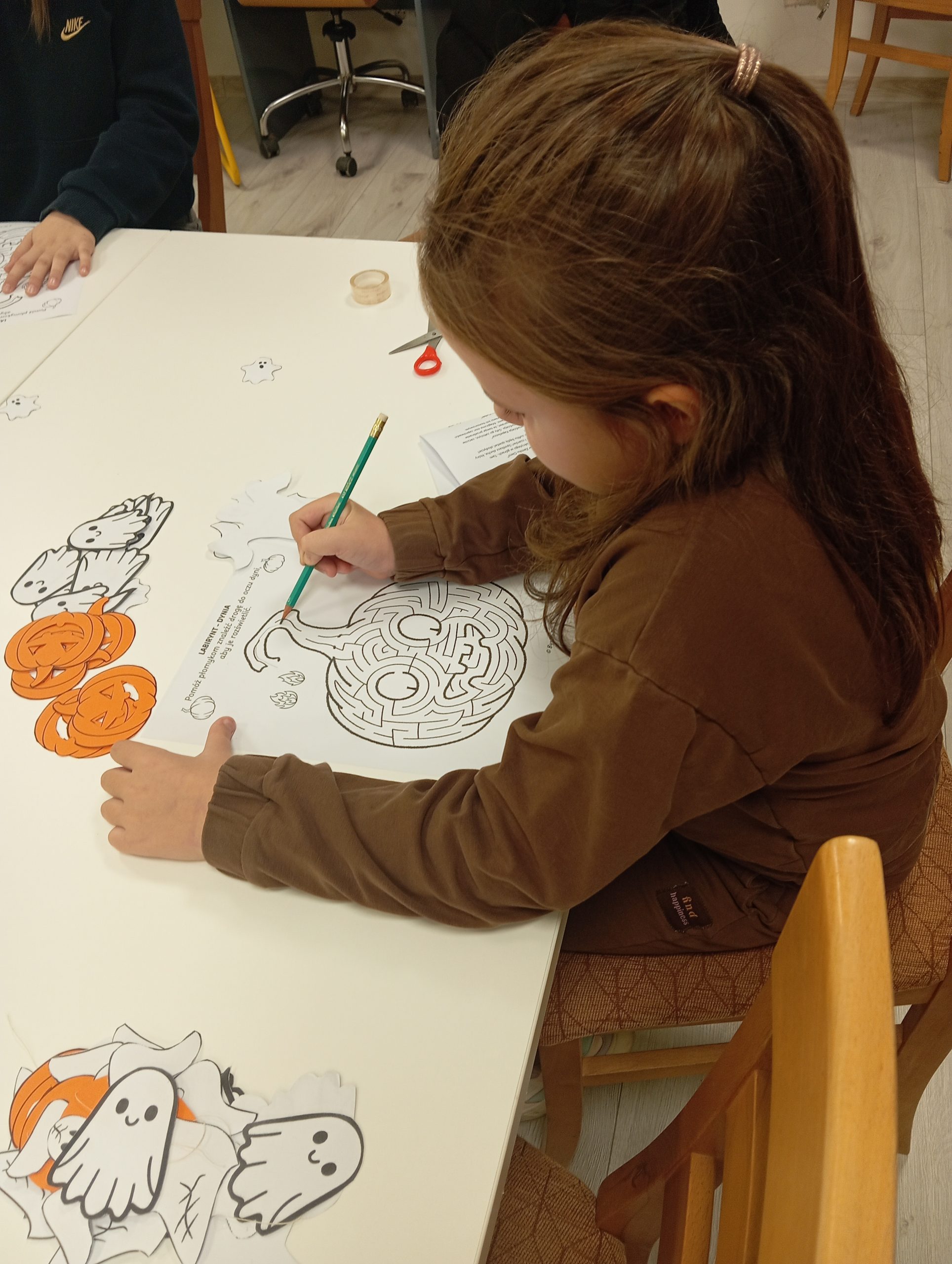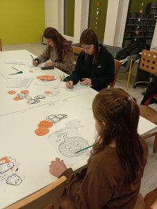 Nasze wydarzenie rozpoczęliśmy od zajęć artystycznych pod nazwą „Szalona Dynia”. Uczestnicy tworzyli kolorowe jesienne girlandy z papierowych dyń, duszków i sznurka, które mogą wykorzystać jako hallowenową ozdobę. Nie zabrakło quizu-wróżby oraz zakręconego dyniowego labiryntu.