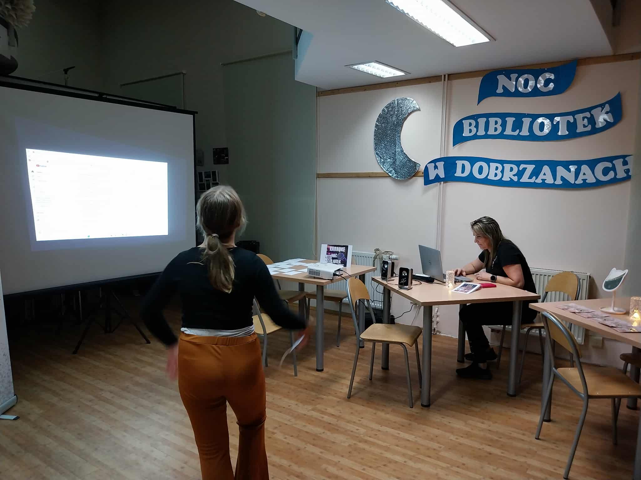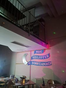 Biblioteka zaprezentowała się w niecodziennej odsłonie: odpowiednia aranżacja przestrzeni biblioteki, zupełnie inna niż na co dzień utworzone zostały tematyczne stoliki z zadaniami, a pośród nich: stolik Karaoke z książką, planszówki nocą- Noc Gier, Bibliotekowe-SPA, stolik "Tę Noc Zapamiętasz" -opowieści uczestników, nie zabrakło również stolika przekąsek (owoców i warzyw) - nie zabrakło pysznej pizzy i znakomitych serowych tostów.