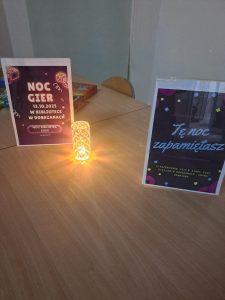 •20.00- 20:30 - udział w zajęciach co kryją stoliki biblioteki nocą ( stolik gier, bibliotekowe SPA, stolik przekąsek, stolik z losami karaoke i książką, wspólny film i stolik opowiadania niezwykłe i poczytajmy razem)