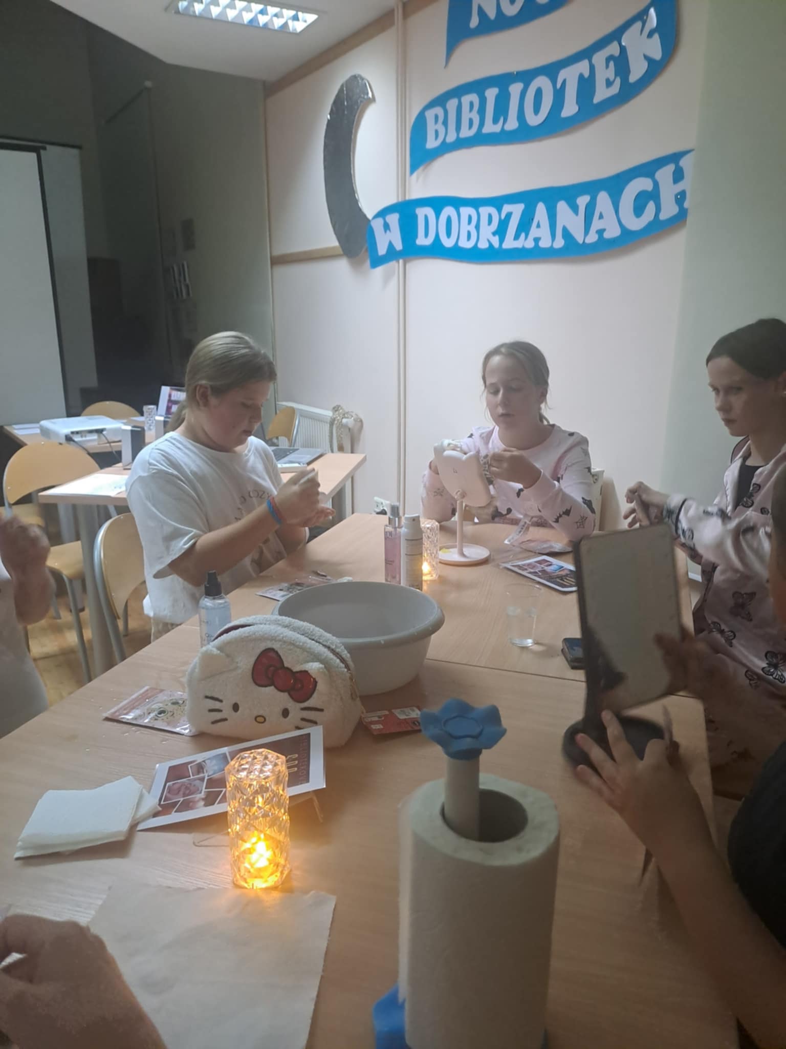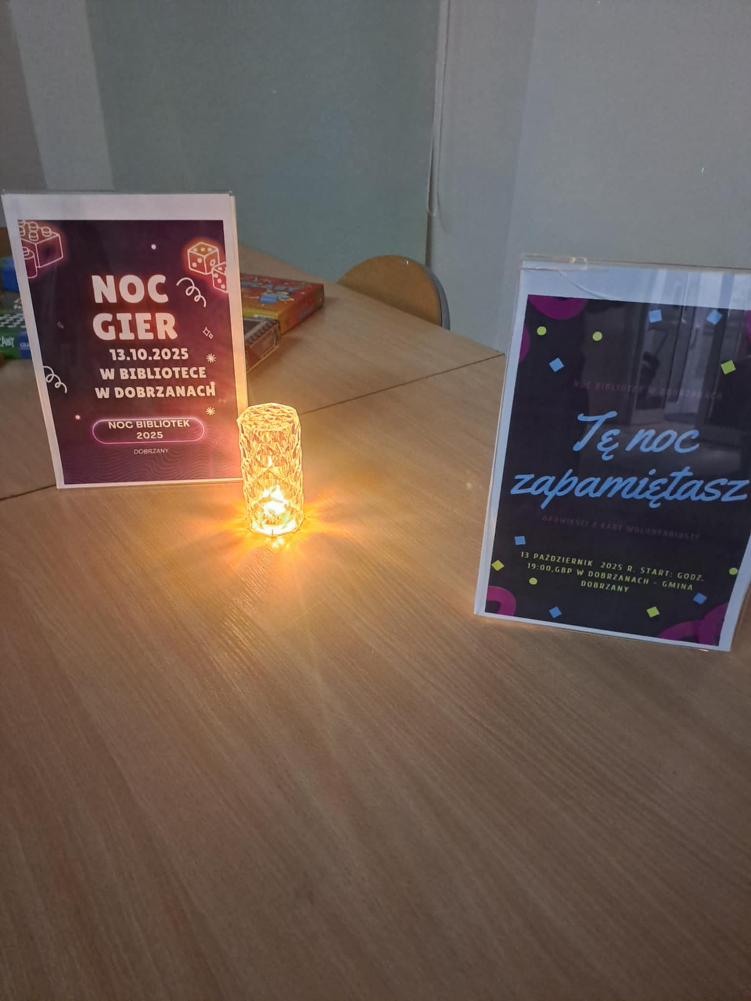 Noc w Bibliotece w Dobrzanach została zorganizowana w dniu 13.10.2025 po raz pierwszy zapisała się w kartach historii Gminnej Biblioteki Publicznej w Dobrzanach. "Do dzieła"- to hasło tegorocznej ogólnopolskiej akcji Noc Bibliotek, które zmobilizowało grupę wolontariuszy do wzięcia udziału w niepowtarzalnym spotkaniu wieczorno-nocnym.
