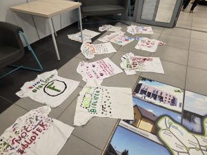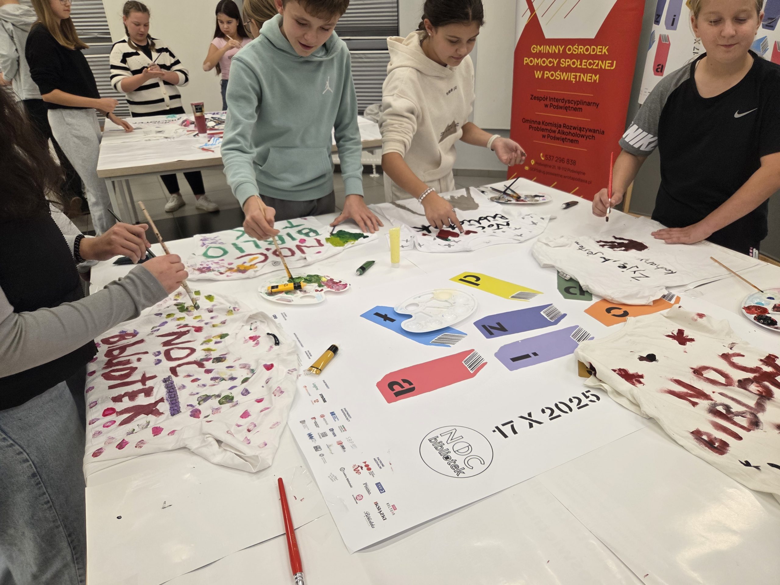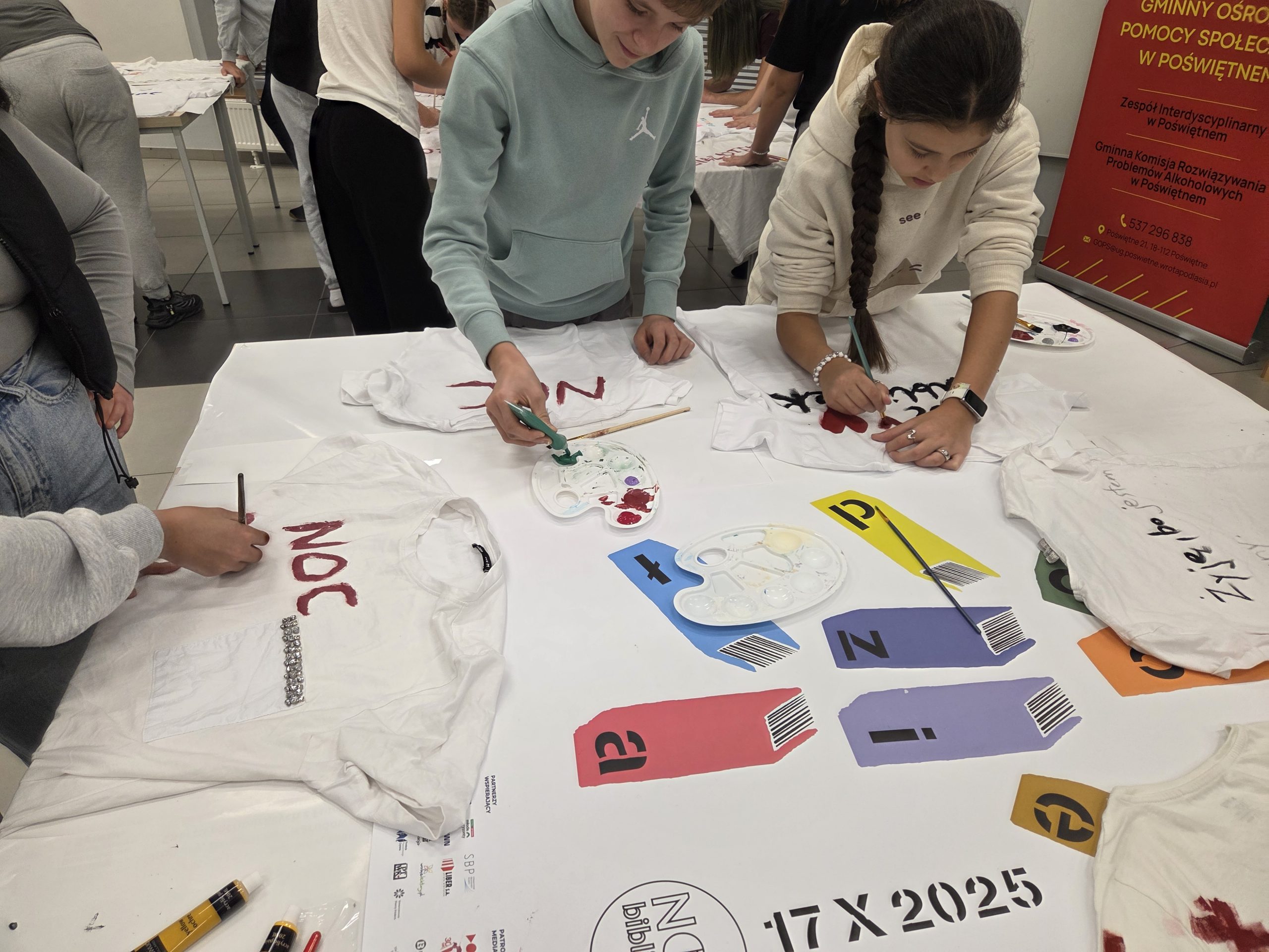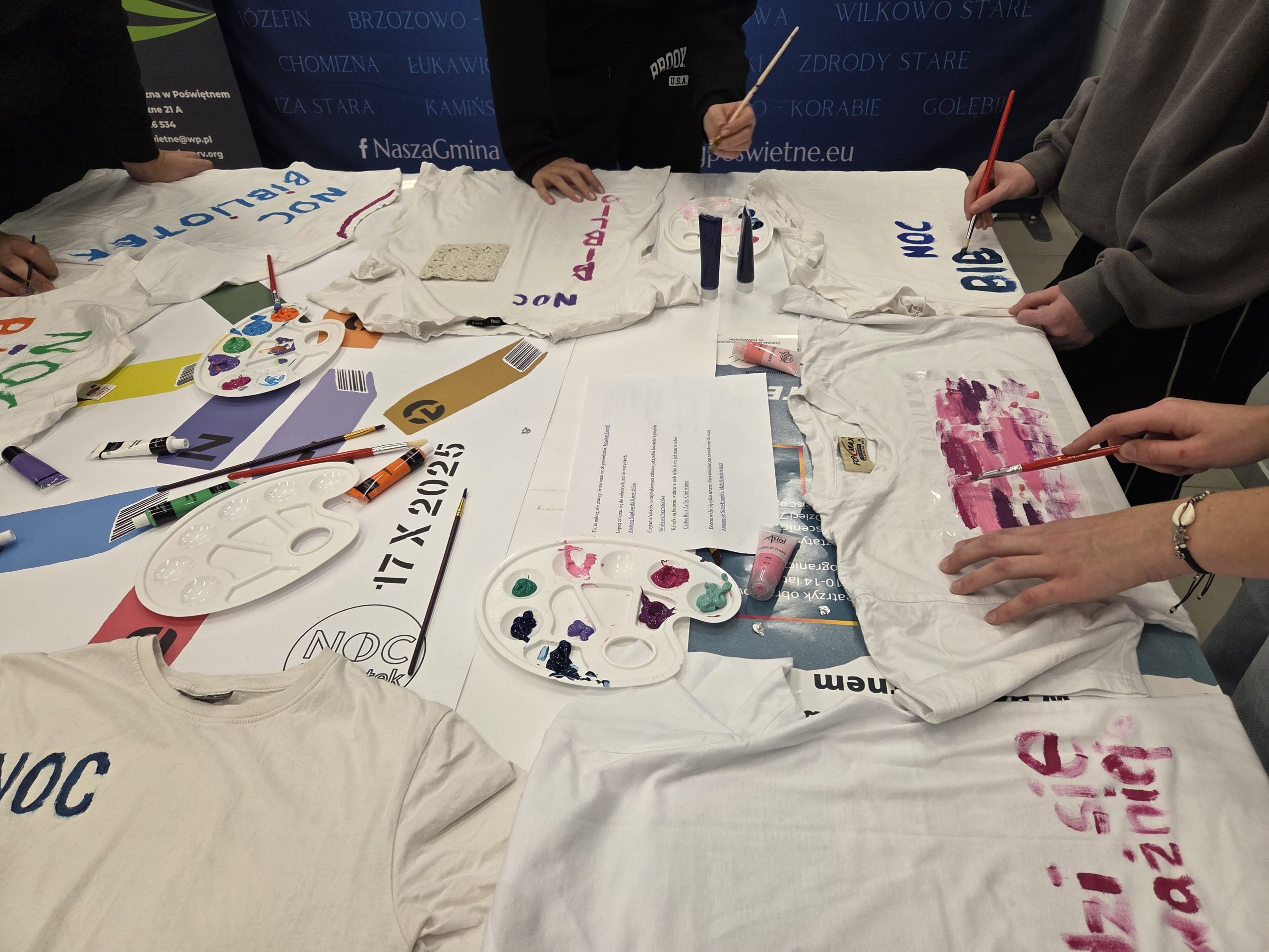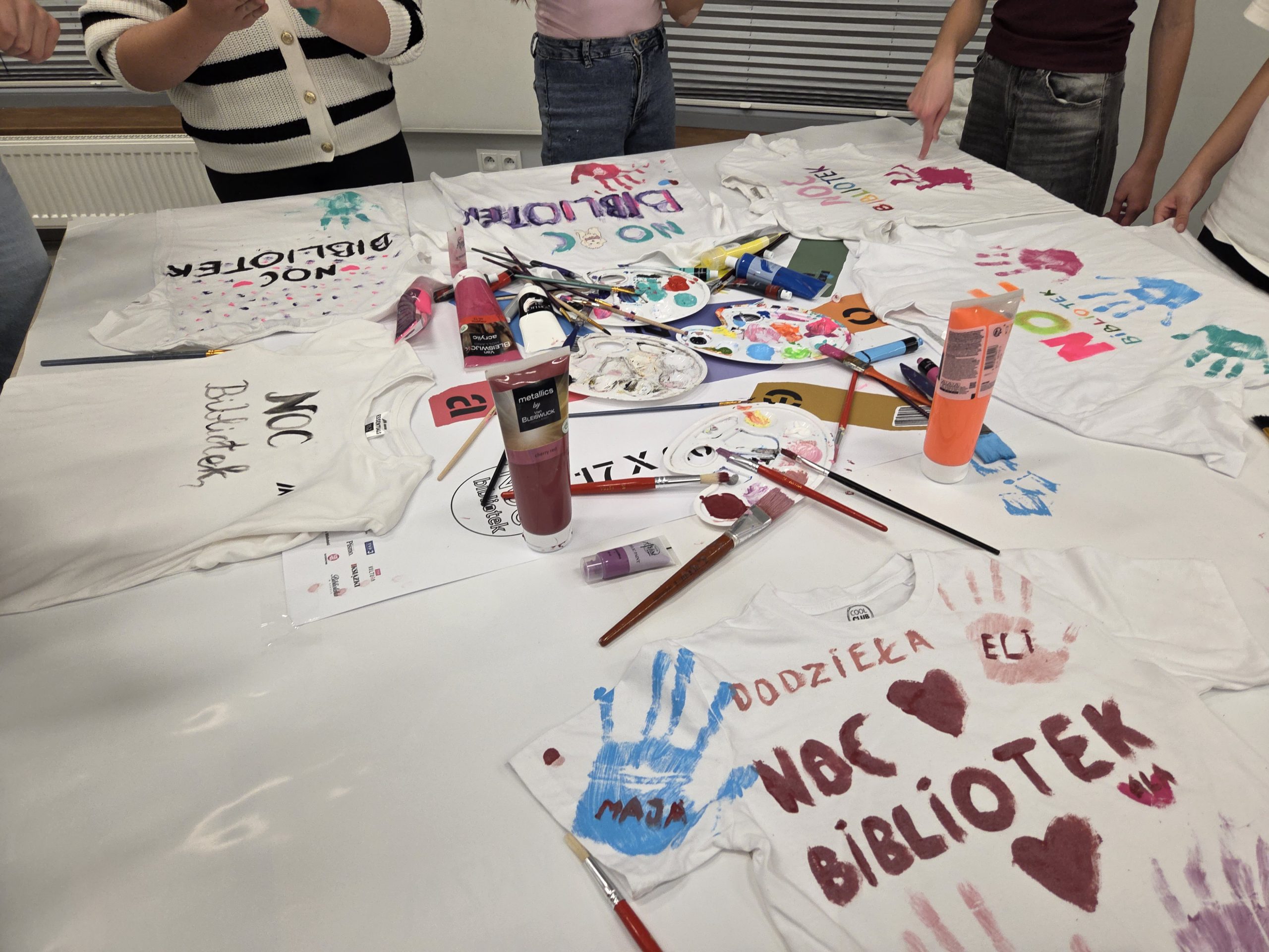 Pierwszą część wydarzenia wypełniły zajęcia plastyczne – uczestnicy ozdabiali koszulki przy pomocy farb, pędzli i własnej wyobraźni. Efektem były oryginalne projekty z hasłem tegorocznej Nocy Bibliotek, które każdy mógł zabrać na pamiątkę.