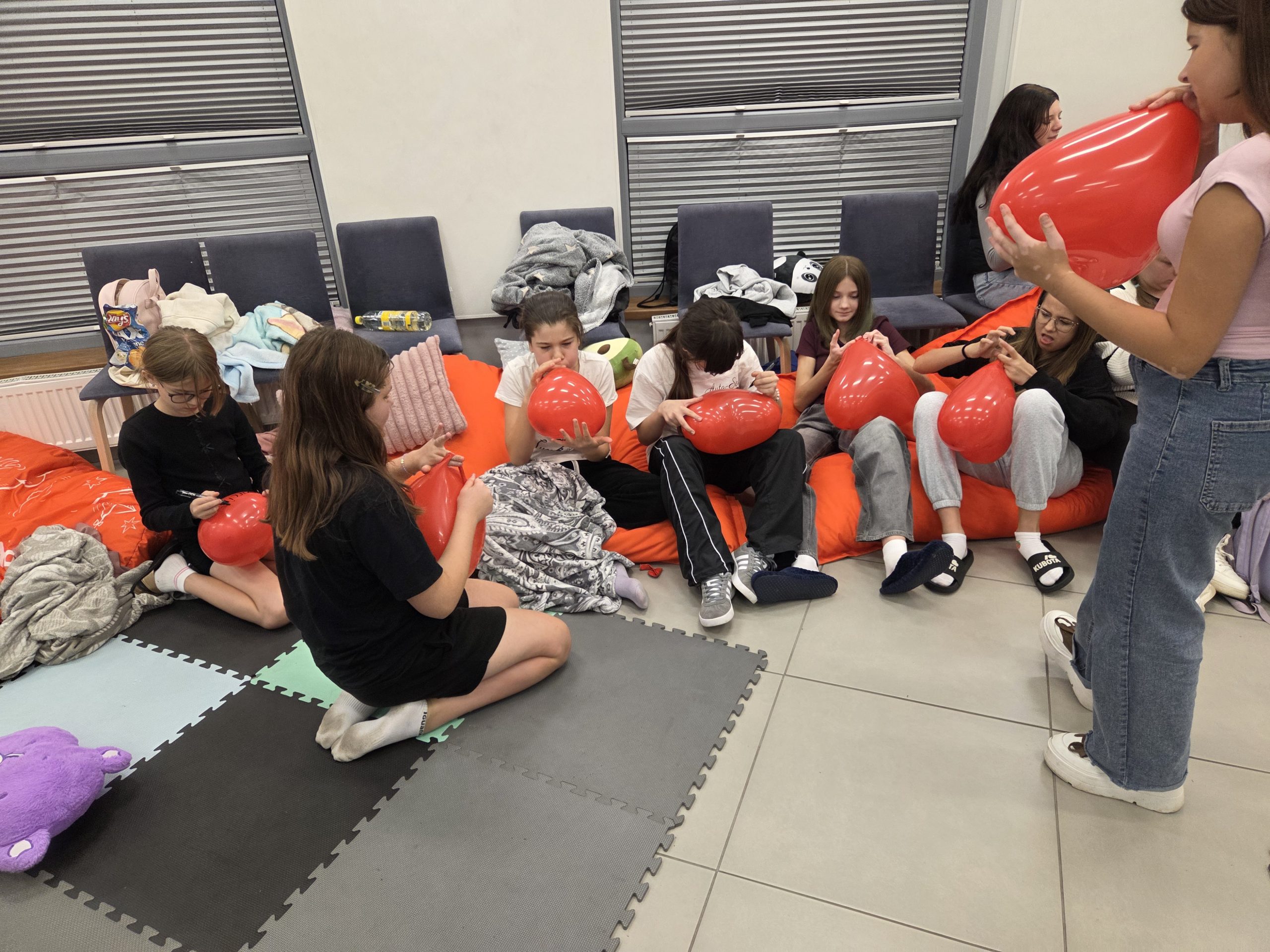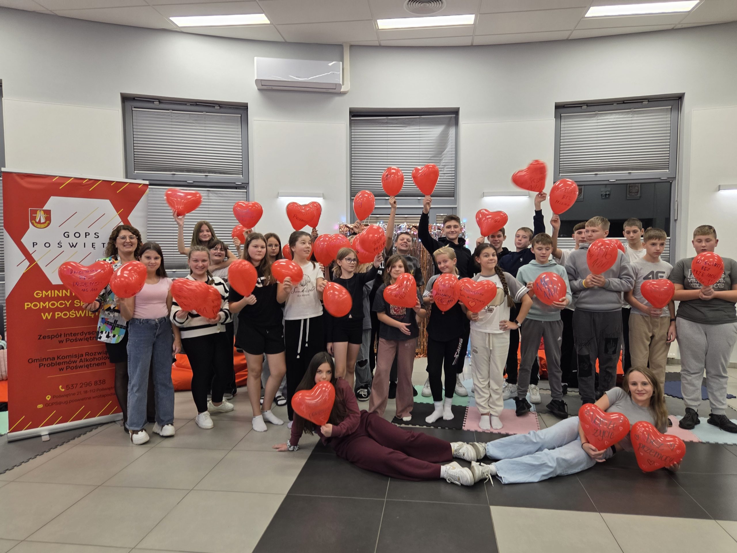 Kolejnym punktem programu była ważna i potrzebna inicjatywa – Kampania „Dzieciństwo bez przemocy”. Informacje o jej założeniach oraz działaniach profilaktycznych przybliżyła młodzieży Pani Izabela Czemierys, Kierownik Gminnego Ośrodka Pomocy Społecznej. Zwieńczeniem tej części była symboliczna akcja „Czerwony balonik”, niosąca przesłanie troski o bezpieczne i dobre dzieciństwo.