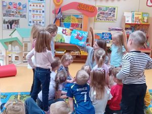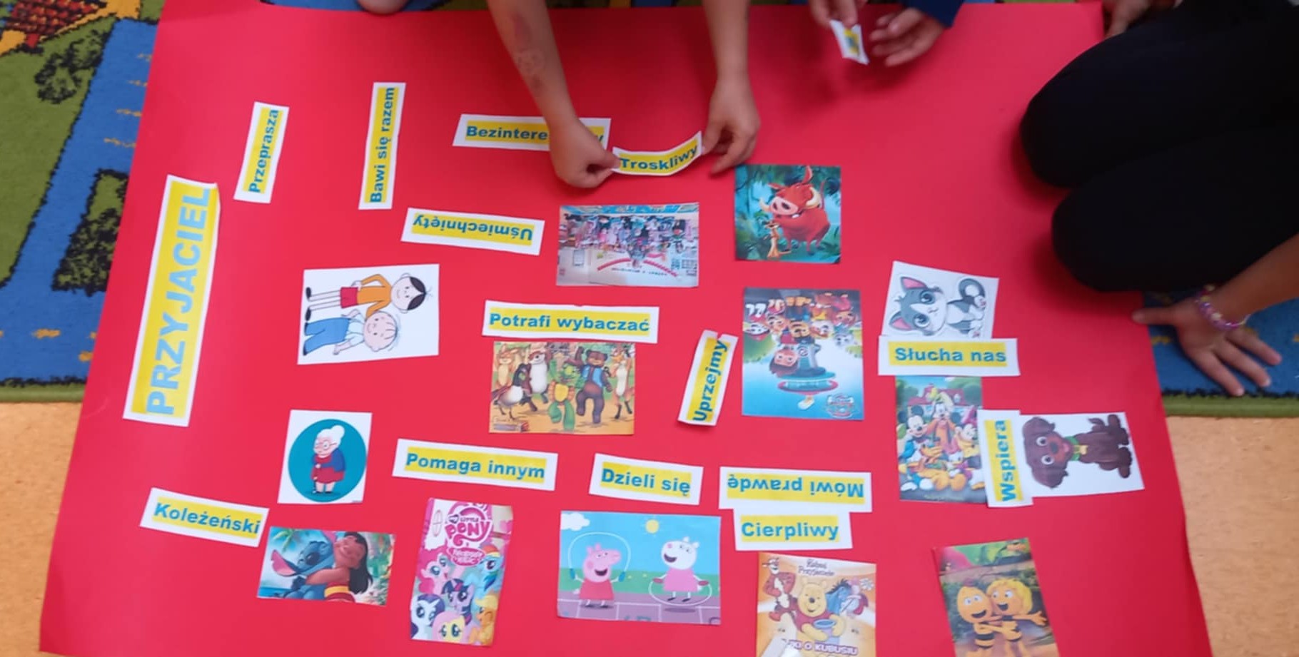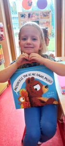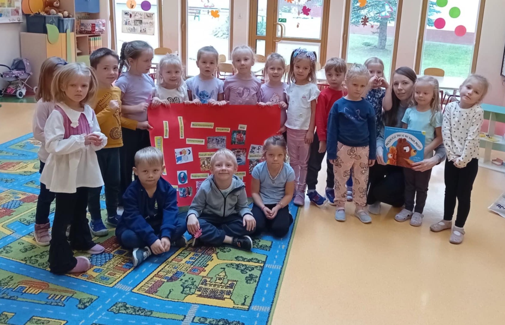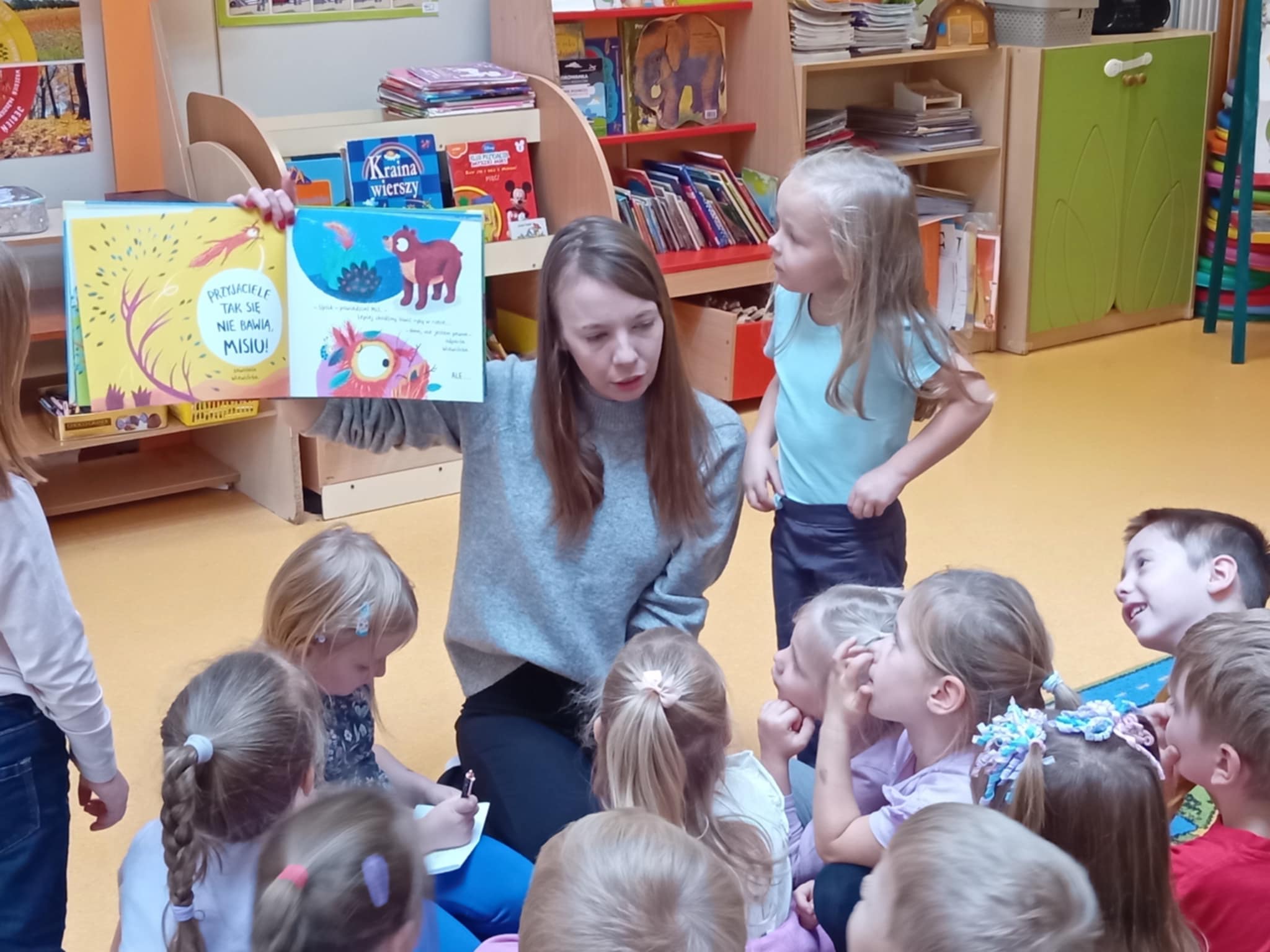 Równolegle filia biblioteczna odwiedziła grupę „Wesołe Dąbki” z ZSP nr 2 i Przedszkola w Zagnańsku. Spotkanie rozpoczęło się od zabawy w dopasowywanie postaci z bajek – Kopciuszek szukał pantofelka, Shrek zgubił Osła, a Stitch… jak zwykle robił zamieszanie! Rozmawialiśmy o tym, jaki jest prawdziwy przyjaciel. Według dzieci to ktoś, kto dzieli się cukierkami, nie psuje budowli z klocków i zawsze mówi „chodź się bawić!”. Czytaliśmy również książkę „ Przyjaciele tak się nie bawią, Misiu!” – i już wiemy, że przyjaźń to nie tylko wspólne zabawy, ale też słuchanie, troska i czasem przeprosiny.