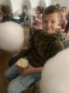 Dzięki wsparciu Centrum Usług Społecznych w Zagnańsku mogliśmy poczuć się jak w prawdziwym kinie – wata cukrowa i popcorn nie tylko smakowały wyśmienicie, ale też stworzyły wyjątkową atmosferę wspólnego oglądania.