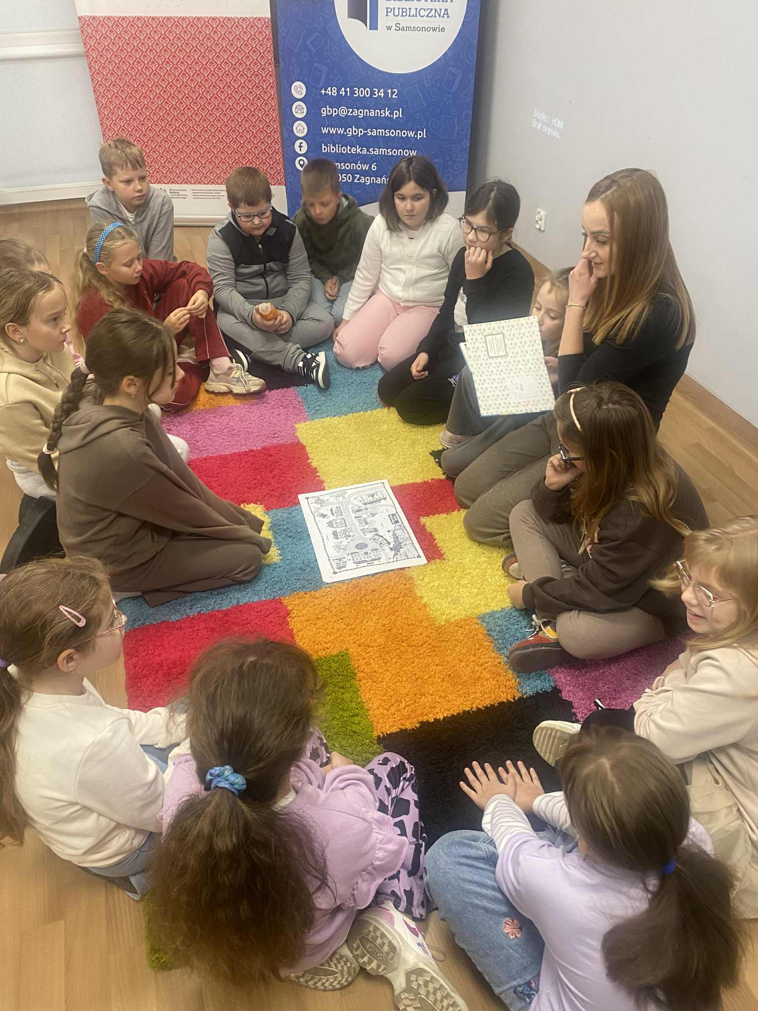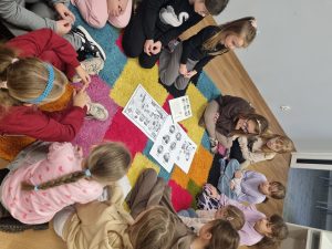 Dzień rozpoczęliśmy z uczniami klasy trzeciej, członkami Dyskusyjnego Klubu Książki, którzy z zapałem zagłębili się w historię „Tajemnica diamentów” Martina Widmarka. Przygody Lassego i Mai porwały młodych czytelników – dzieci z entuzjazmem rozwiązywały zagadki, dzieliły się spostrzeżeniami i snuły własne teorie dotyczące bohaterów. Następnie dołączyli uczniowie klasy pierwszej, by wspólnie obejrzeć ekranizację „Rabuś z pociągu”, również opartą na serii Widmarka. Seans okazał się strzałem w dziesiątkę – pełen humoru, przygód i niespodziewanych zwrotów akcji. Trzymał dzieci w napięciu do ostatniej minuty.