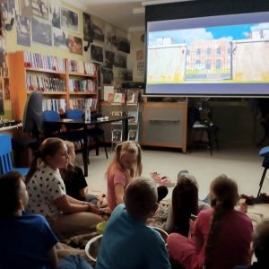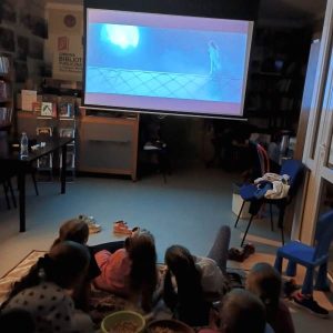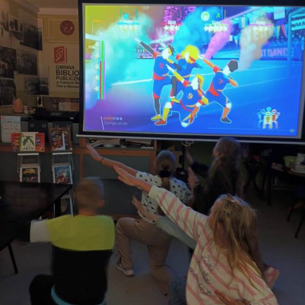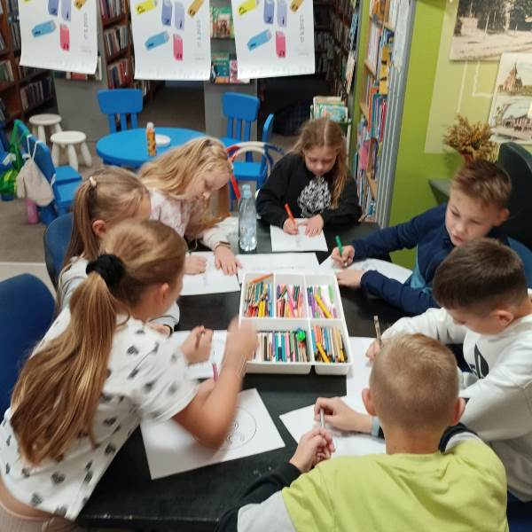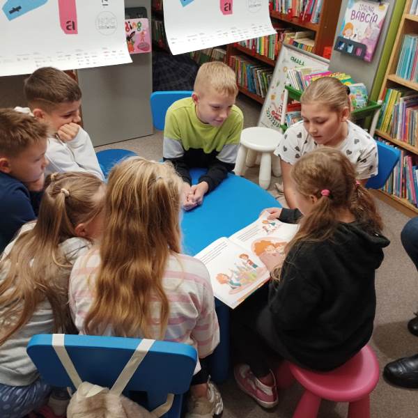 Biblioteka publiczna, ogólnie dostępna dla wszystkich, współpracująca z lokalną społecznością, posiadająca na ścianie fototapetę.