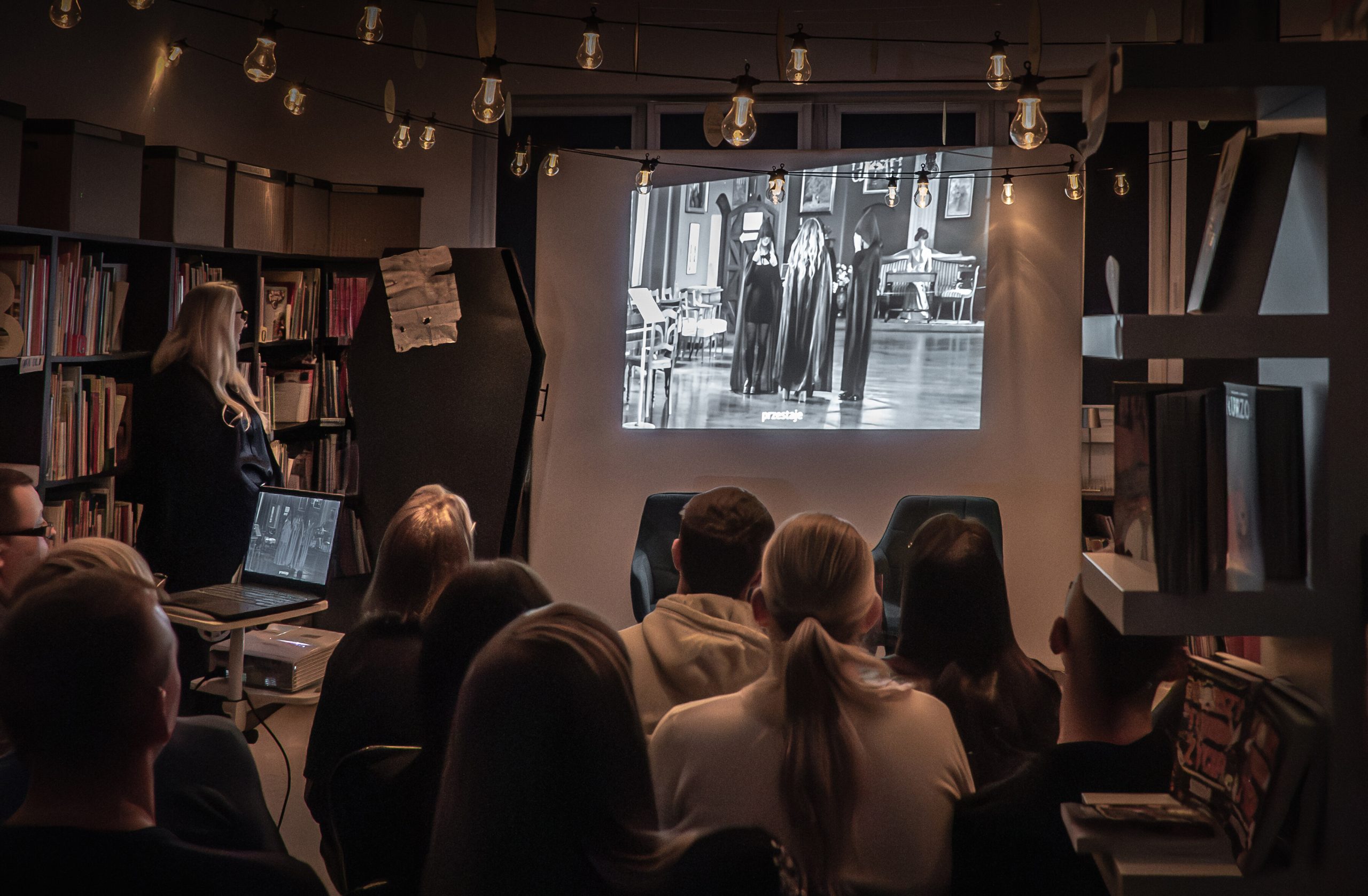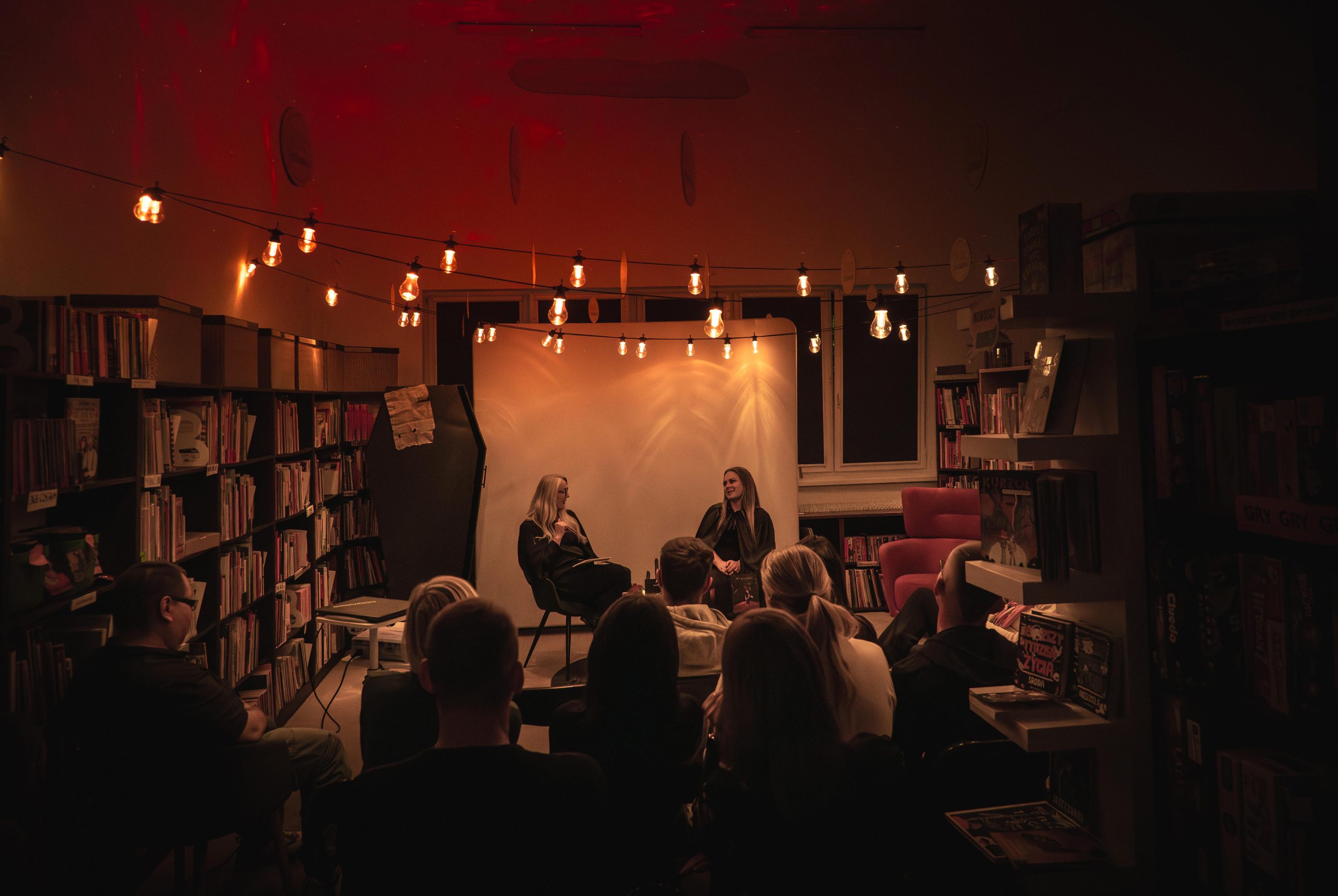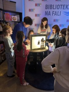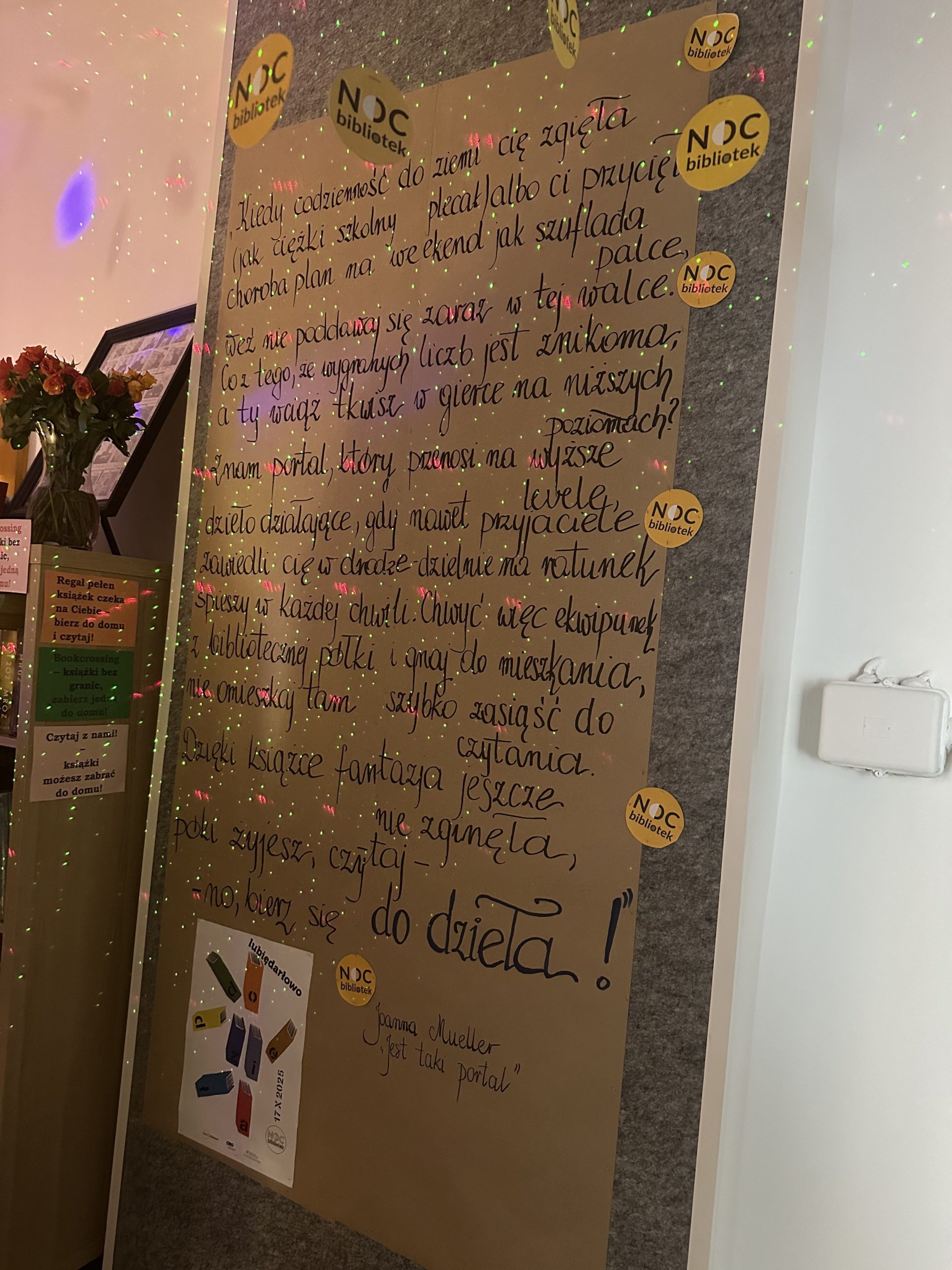 Już od wczesnego popołudnia uczestnicy mieli okazję zanurzyć się w literaturze, kreatywności i inspirujących działaniach. Rozpoczęliśmy poetyckim speed-datingiem, do którego wykorzystana została AI, która sprawiła, że Maria Pawlikowska-Jasnorzewska przemówiła do młodzieży. Dzieci bawiła się w teatr cieni, któremu towarzyszył literacki piknik. Dorośli mieli okazję wziąć udział w unikalnym projekcie „Lem na elektronicznych bitach” – czyli połączenie literatury z muzyką elektroniczną. Wieczór sprzyjał spotkaniom, również tym literackim, czytelnicy mieli przyjemność posłuchać rozmowy z darłowską pisarką Kamilą Malec. A w późnych godzinach wieczornych młodzież zorganizowała maraton czytania książek-niespodzianek. W trakcie wieczoru panowała atmosfera twórczego zaangażowania – hasło „Do dzieła!” znalazło odbicie we wspólnych działaniach: od warsztatów literackich i muzycznych, po rozmowy o książkach.