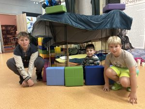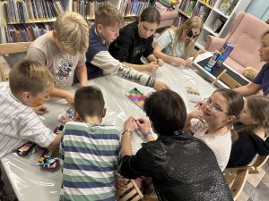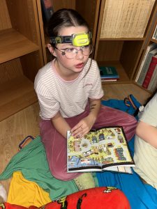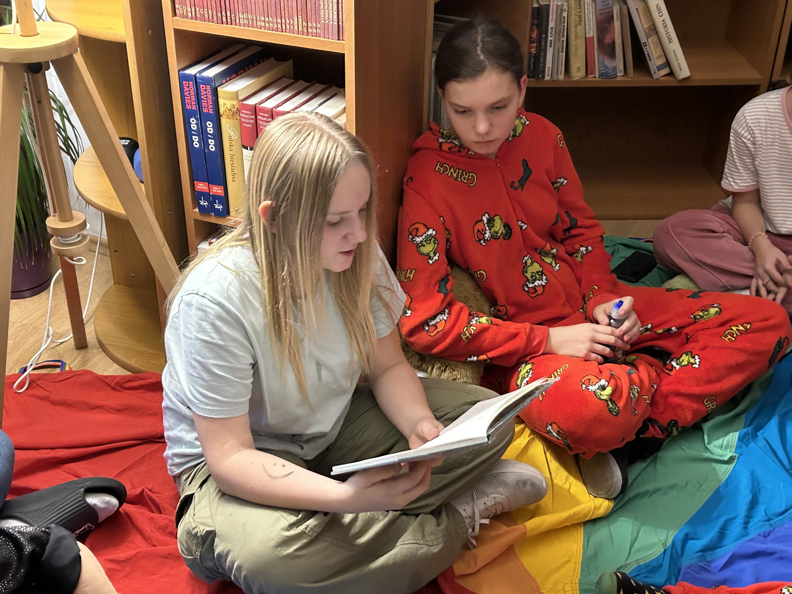 Kiedy zapadła noc, uczestnicy przenieśli się do czytelni dla dorosłych, gdzie przy ciepłym świetle lampy wspólnie przeczytali fragment książki „Biuro Detektywistyczne Lassego i Mai”. Następnie, już w śpiworach, obejrzeli film „Biuro Detektywistyczne Lassego i Mai. Rabuś z pociągu”, powoli zasypiając przy dźwiękach dialogów i szelestach popcornu. Między regałami z książkami, w blasku lampek i śmiechu uczestników, biblioteka na chwilę zamieniła się w mały kosmos – pełen ciepła, wyobraźni i wspólnej radości.
