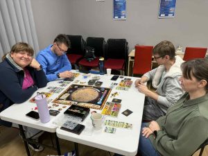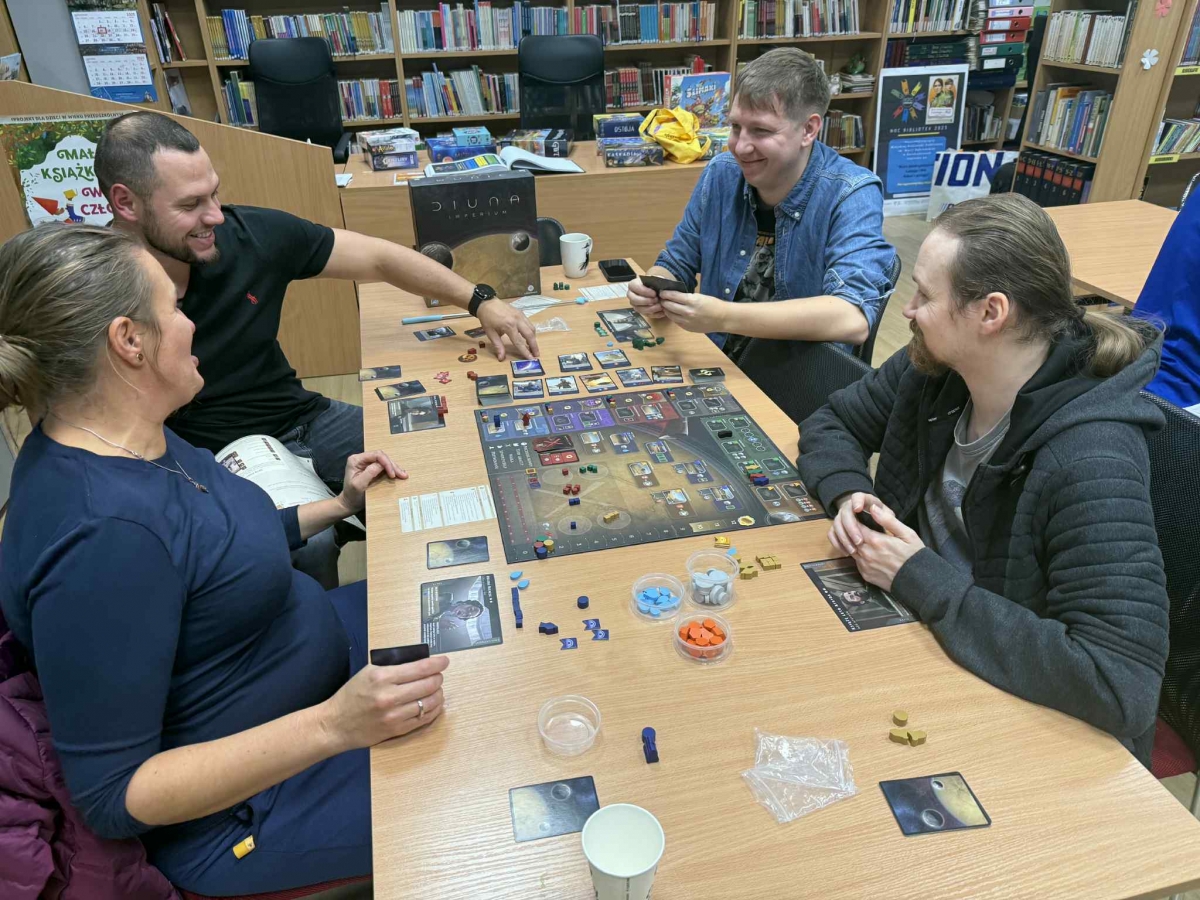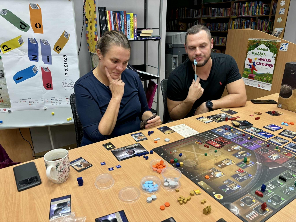 Oddział Dziecięcy Miejskiej Biblioteki Publicznej w Świebodzicach rozpoczął obchody w sobotę, 11 października, podczas „Kinoranka”. Tego dnia dzieci obejrzały film „Biuro detektywistyczne Lassego i Mai. Rabuś z pociągu” – tegoroczną propozycję Nocy Bibliotek, opartą na bestsellerowych książkach Martina Widmarka. Po sobotnim seansie projekcje filmu kontynuowano także w dniach 13, 15, 16 i 17 października. Uczestnikami byli uczniowie Szkoły Podstawowej nr 2 oraz Szkoły Podstawowej Integracyjnej z dzielnicy Ciernie, którzy licznie odwiedzili bibliotekę, by wspólnie przeżyć filmową przygodę. Poza projekcją filmową, w ramach obchodów Nocy Bibliotek, 16 października odbyły się również rozgrywki w gry planszowe, zorganizowane we współpracy z klubem planszówkowym „ŚwieboDice”. Członkowie klubu z zaangażowaniem tłumaczyli zasady gier i grali wspólnie z nowymi uczestnikami. Nie brakowało śmiechu, emocji i planszówkowych przygód. Na stołach pojawiły się różnorodne tytuły, m.in. . Diuna: Imperium, Terraformacja Marsa, Splendor, Dixit, Skubane kurczaki. Całość dopełniała przyjazna atmosfera i drobny poczęstunek. Spotkanie koordynował Grzegorz Matejko – nasz zaprzyjaźniony wolontariusz, który wielokrotnie prowadził w bibliotece rozgrywki w gry planszowe, dzieląc się swoją wiedzą i pasją. Tym razem przygotował zestaw gier dla średniozaawansowanych i zaawansowanych graczy, dzięki czemu wieczór obfitował w strategiczne wyzwania i ciekawe mechaniki. Nie zapomniał jednak o osobach początkujących – dla nich również przygotował gry idealnie wprowadzające w świat planszówek.