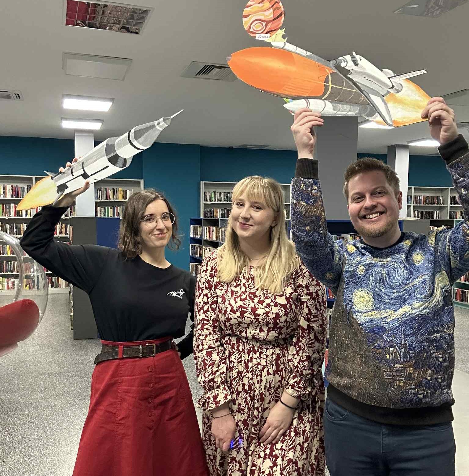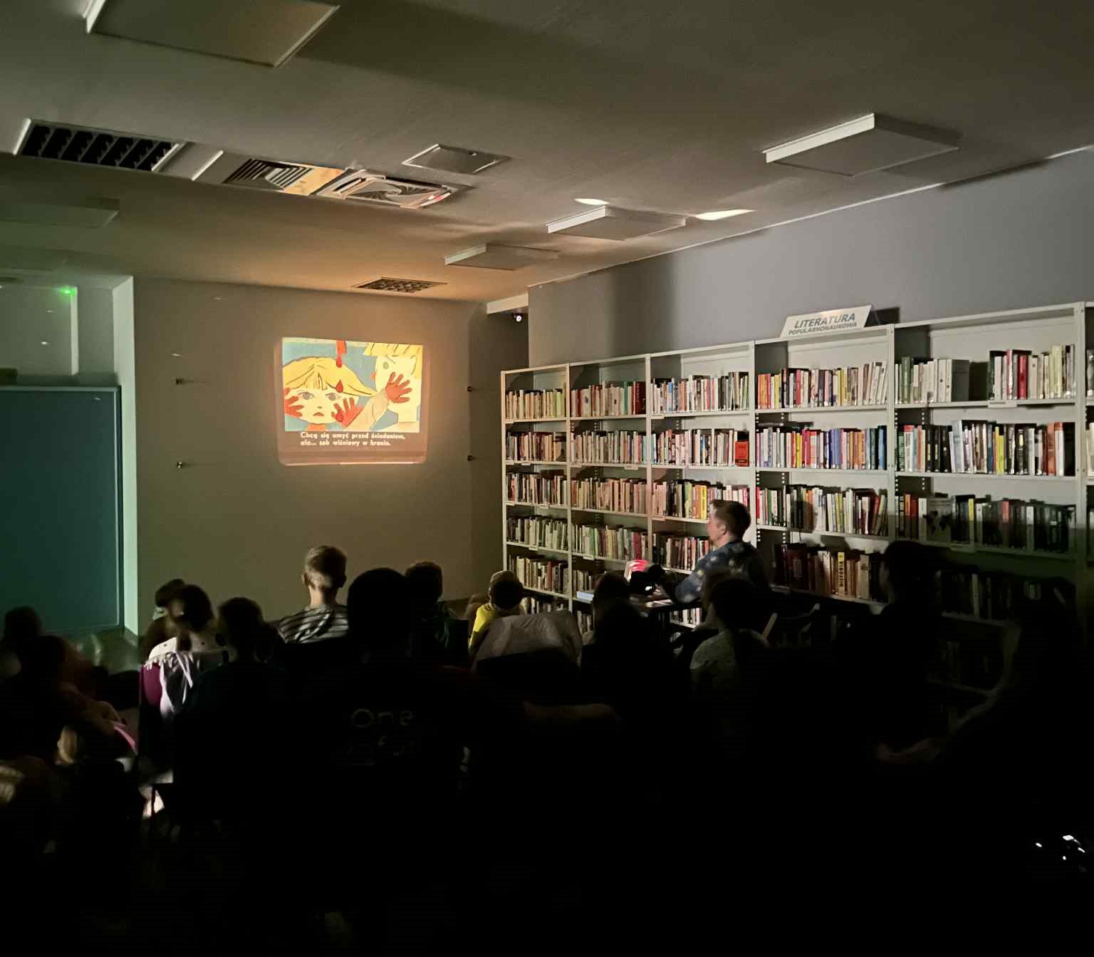 W tym roku Filia nr 4 po raz drugi zorganizowała Noc Bibliotek. Jednak nie była to zwykła noc, lecz kosmiczny wieczór! Rozpoczęliśmy od escape roomu dla naszych młodszych czytelników. Uczestnicy musieli rozwiązać kosmiczne zagadki, aby uratować statek kosmiczny i ocalić załogę przed kosmitą Zgrzytusiem. Wszystkie cztery drużyny podołały temu zadaniu. Wieczór natomiast spędziliśmy na oglądaniu bajek wyświetlanych za pomocą ponad 50-letniego diaskopu. Towarzyszyło temu głośne czytanie tekstu w interpretacji kierownika filii. Zaczęliśmy - a jakże! - kosmicznie, od bajki "Lecimy na nieznaną planetę". Goście mogli obejrzeć także bajki: "O dzielnym marynarzyku", "Posadził dziad rzepę" i "O żabkach w czerwonych czapkach". Wydarzenie cieszyło się zainteresowaniem nie tylko najmłodszych, ale także dorosłych, którzy pamiętali bajki ze swojego dzieciństwa. Sentymentalny, kosmiczny wieczór w bibliotece dopisał także frekwencyjnie. Diaskopowych bajek mamy jeszcze więcej, dlatego zapraszamy już za rok!