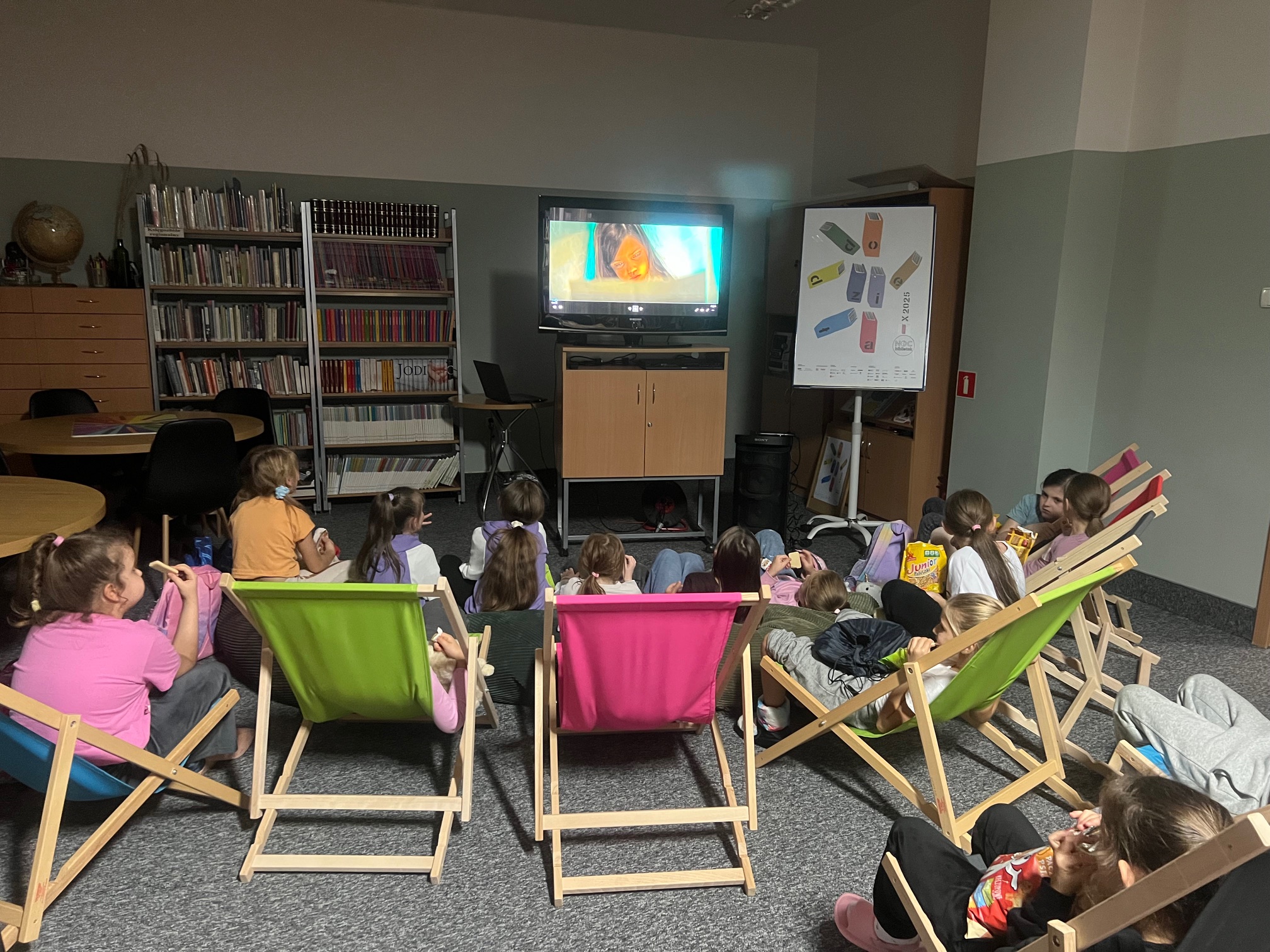 Hasło tegorocznej edycji brzmiało „Do dzieła!”. Wydarzenie miało zachęcać do aktywności czytelniczej, współtworzenia działań w środowiskach lokalnych oraz integracji wśród czytelników. Na nasze zaproszenie odpowiedziało Ognisko nr 3 Towarzystwa Przyjaciół Dzieci w Koninie. Dzieci z ogromną radością pojawiły się w progach biblioteki, aby miło spędzić czas wśród rówieśników. Spotkanie rozpoczęliśmy od pracy plastycznej, aby po niej płynnie przejść do relaksu z przekąską przed telewizorem. Film okazał się strzałem w dziesiątkę. Przygody Lassego i Mai wszystkim przypadły do gustu. Wisienką na torcie całego wydarzenia było karaoke i wspólne tańce przy muzyce. Uczestnikom bardzo szybko minął czas, za szybko. Kiedy rodzice stali w korytarzu, aby odebrać swoje pociechy, muzyka w bibliotece brzmiała w najlepsze, a końca imprezy nie było widać.