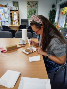 To oczywiste, że przygotowania dużo wcześniej zostały przeprowadzone poczynając od Mapy, plan wydarzeń informacji, na Fb, plakaty, informacje w prasie lokalnej i „Do Dzieła”, przede wszystkim nie mogło zabraknąć typowych akcentów plastycznych, plakatowych związanych z Nocą Bibliotek. Izerka tablice, drzwi ozdobiła i przypomniała jak było przez ostatnie lata, jakie hasła funkcjonowały. Ustalając plan działań, mogłyśmy liczyć na twórczy potencjał przedsiębiorczyni Izabeli Janiak z Pracowni Piernikowej, która od razu dała hasło „Piernikowe Dzieła” czyli warsztaty dla Seniorów, z cyklu Polecajki Izerki dodaliśmy i Nocy Bibliotek 2025 oczywiście została „Jeżycjada”.