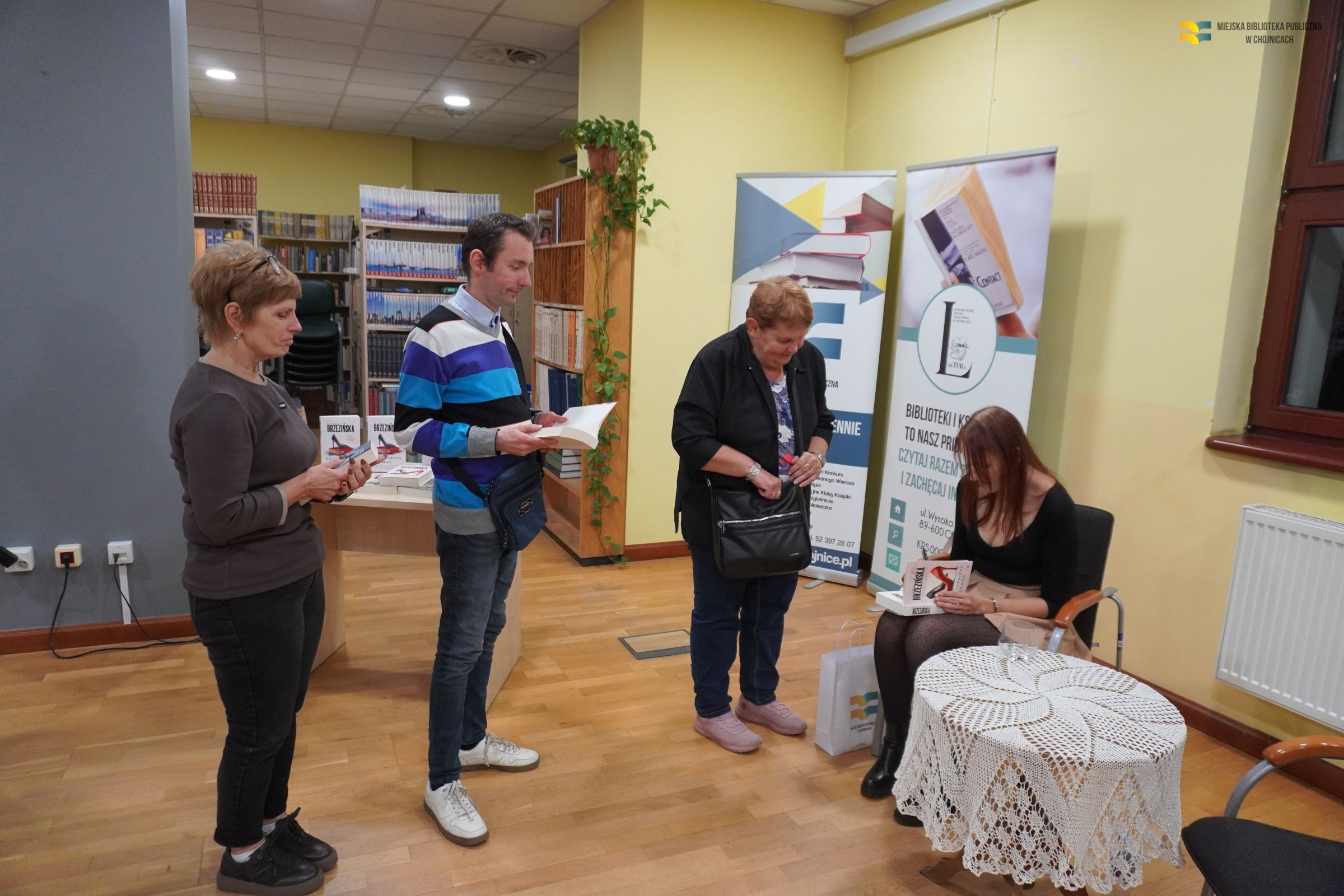 Wieczór w Czytelni rozpoczął się od rozstrzygnięcia konkursu plastycznego dla dzieci na zakładkę do książki. Następnie publiczność mogła podziwiać pokaz tańca w wykonaniu członkiń Stowarzyszenia Aktywni 50+, które zaprezentowały kilka dynamicznych choreografii, nagrodzonych gromkimi brawami i upominkowymi książkami. Kolejnym punktem programu było spotkanie autorskie z Dianą Brzezińską – pisarką powieści kryminalnych, prawniczką i moderatorką. Rozmowę z autorką poprowadziła bibliotekarka Anna Maria Zdrenka, przybliżając uczestnikom twórczość Brzezińskiej, w tym jej popularne serie kryminalne. Pisarka opowiadała o kulisach pracy twórczej, roli bohaterów w jej powieściach oraz inspiracjach związanych ze Szczecinem – miastem, które często pojawia się w jej książkach. Zdradziła także plany dotyczące nowych tytułów, m.in. powieści o „szczecińskich kanibalach” oraz czwartego tomu serii z profilerem Aleksandrem Lewisem. Spotkanie zakończyło się wspólnymi rozmowami, autografami i pamiątkowymi zdjęciami. Równolegle w Czytelni można było obejrzeć wystawę „Dzieła kreatywnych bibliotekarzy i ich pasje”, prezentującą różnorodne prace wykonane przez bibliotekarzy – od rękodzieła i haftu, przez szydełkowe ozdoby, po fotografie, biżuterię i obrazy z puzzli. Ekspozycja udowodniła, że bibliotekarze to nie tylko miłośnicy literatury, lecz także prawdziwi artyści i pasjonaci wielu dziedzin.