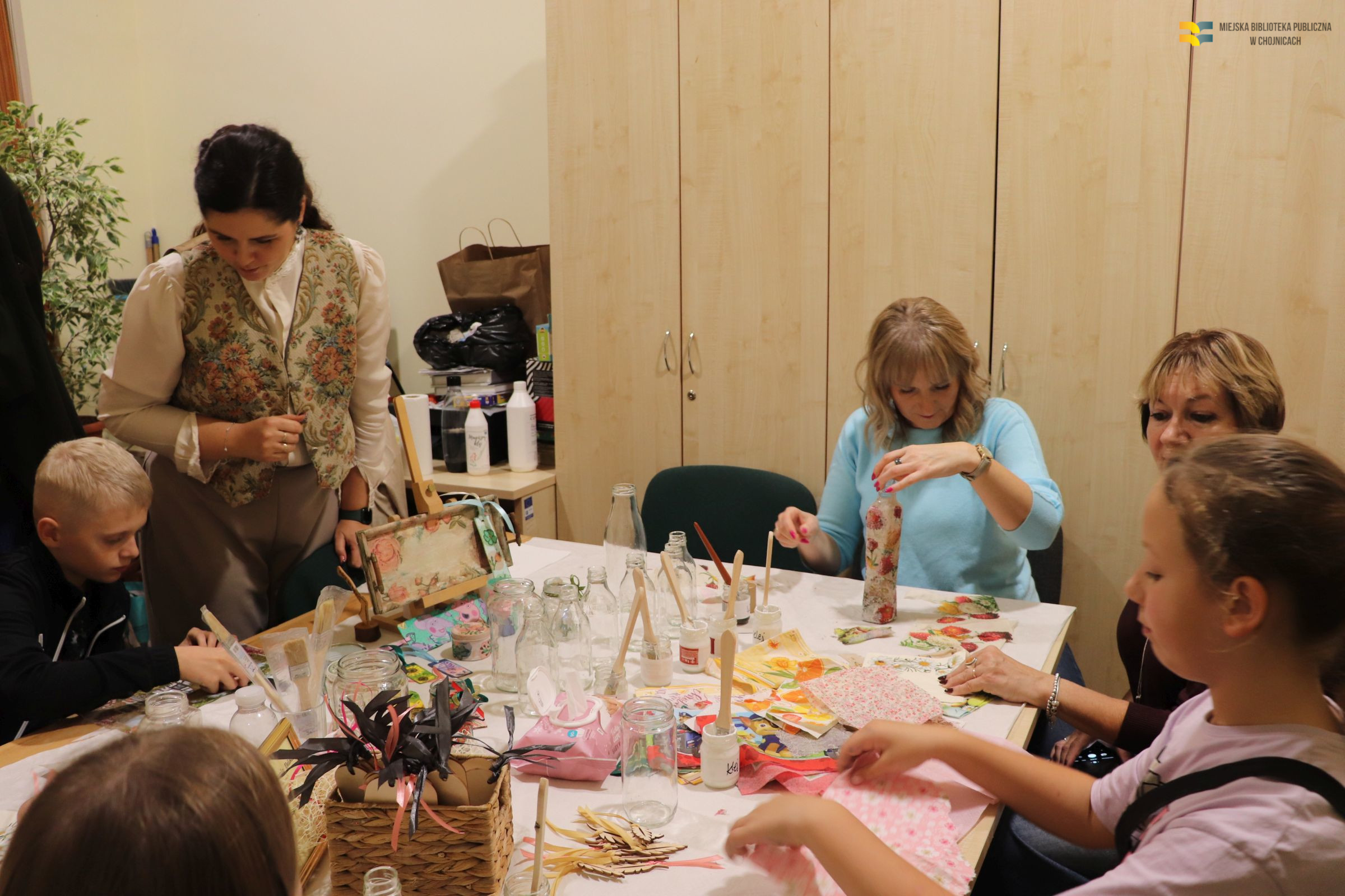 W Mediatece uczestnicy mogli tworzyć witraże i ozdoby z płyt CD, a najmłodsi – kolorować zakładki i rozwiązywać zadania plastyczne. Działały również dwie wystawy: „Do dzieła” – poświęcona twórcom muzyki, literatury i filmu, oraz ekspozycja papierowych i płytowych zwierząt. W Wypożyczalni i Czytelni Naukowej gościli Krystyna i Andrzej Mięsikowscy, prezentując swoje rękodzieła – hafty i wyroby z drewna. Odbyły się też warsztaty decoupage prowadzone przez Małgorzatę Deliktę, podczas których każdy mógł stworzyć własne dzieło. Dodatkowo rozstawione sztalugi pozwoliły odwiedzającym spróbować swoich sił w malarstwie. W tle rozbrzmiewały gitarowe dźwięki w wykonaniu Stanisława Czapiewskiego, a obok można było podziwiać wystawę fotografii Katarzyny Sadowczyk „Dzieło w moim obiektywie”. W Wypożyczalni Literatury Pięknej i Popularnej dla Dorosłych prezentowano akwarele chojnickiej malarki Małgorzaty Sznajdrowskiej, która spotkała się z czytelnikami i rozdawała autografy. Dla najmłodszych przygotowano konkurs „Jaka to bajka”, a dorośli mogli sprawdzić swoją wiedzę literacką w quizie „Dopasuj tytuł do autora”.