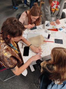 Czytelniczka, choć nieco onieśmielona, spojrzała z uznaniem na tę niezwykłą instalację i właściwie nie wiedziała sama, jak to się stało, że nogi pokierowały ją w innym, niż wcześniej planowała kierunku. Zaintrygowało ją to, co działo się dalej, pomiędzy regałami. Przy dwóch dużych stołach siedziały osoby, wykonujące coś w dużym skupieniu. Jeden ze stołów pełen był suszonych kwiatów, patyczków i gliny, z których robiono właśnie ozdobne, naturalne zawieszki. Drugi zajęty był przez kobiety malujące coś na miniaturowych podobraziach. Przy trzecim znajoma bibliotekarka, ubrana w złotą suknię, niczym z obrazu Klimta, pomagała właśnie tworzyć tatuaże kalkowe w kształcie różnych postaci z książek. – Jak dawno nie widziałam takiej fioletowej kalki, ciekawe, że jeszcze ktoś z niej korzysta… – powiedziała półgłosem.
