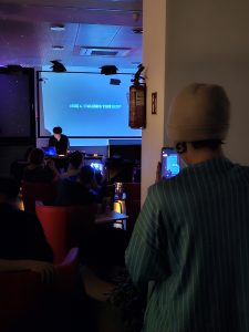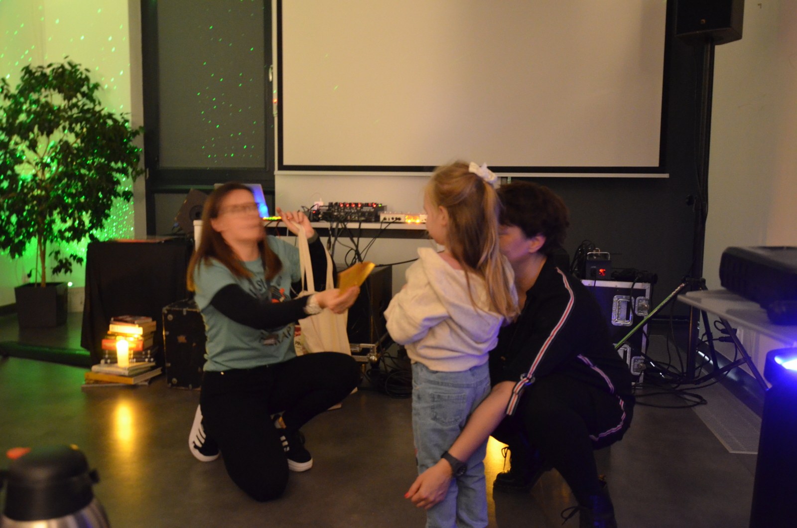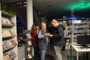 Na początek uczestnicy wzięli udział w konkursie „Uważne Ucho”, w którym do wygrania były słuchawki bezprzewodowe oraz książka. Zadaniem uczestników było odnalezienie w przestrzeni bibliotecznej pięciu punktów audio, wsłuchanie się w przygotowane odgłosy i próba ich rozpoznania. Jak się okazało, najwięcej trudności sprawiło odgadnięcie dźwięku... okładanych książek!