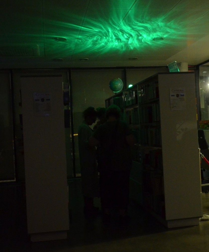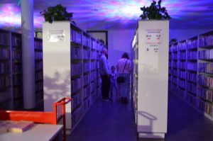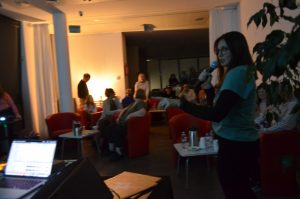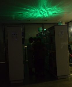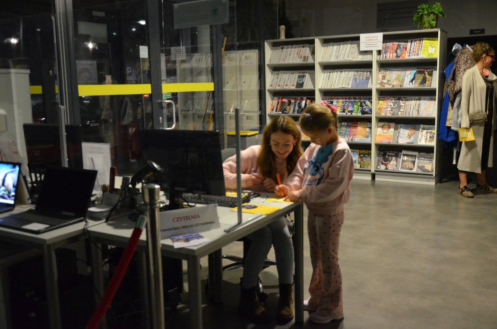 Główną atrakcją wieczoru była prezentacja Ane – świeckiej producentki muzyki elektronicznej, która w swoich kompozycjach wykorzystuje nagrania dźwięków otoczenia, łącząc je z brzmieniem syntezatorów oraz instrumentów etnicznych i folkowych z różnych zakątków świata. Inspiracją do piątkowego występu były odgłosy naszego miasta, wśród których można było usłyszeć także głos małej Toli. Dziewczynka, dziś już czteroletnia, a w chwili nagrania mająca półtora roku, została uwieczniona przez Ane – jej głos znalazł się w tworzonych przez artystkę miksach. Co więcej, właśnie podczas Nocy Bibliotek Tola obchodziła swoje czwarte urodziny! Po wysłuchaniu przygotowanego materiału wspólnie odśpiewaliśmy jej „Sto lat!”, a mała jubilatka wylosowała zwycięzcę konkursu… którym okazała się… ona sama!
