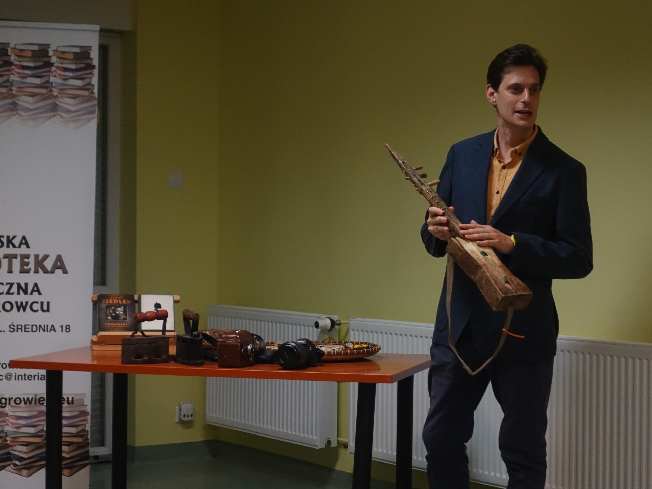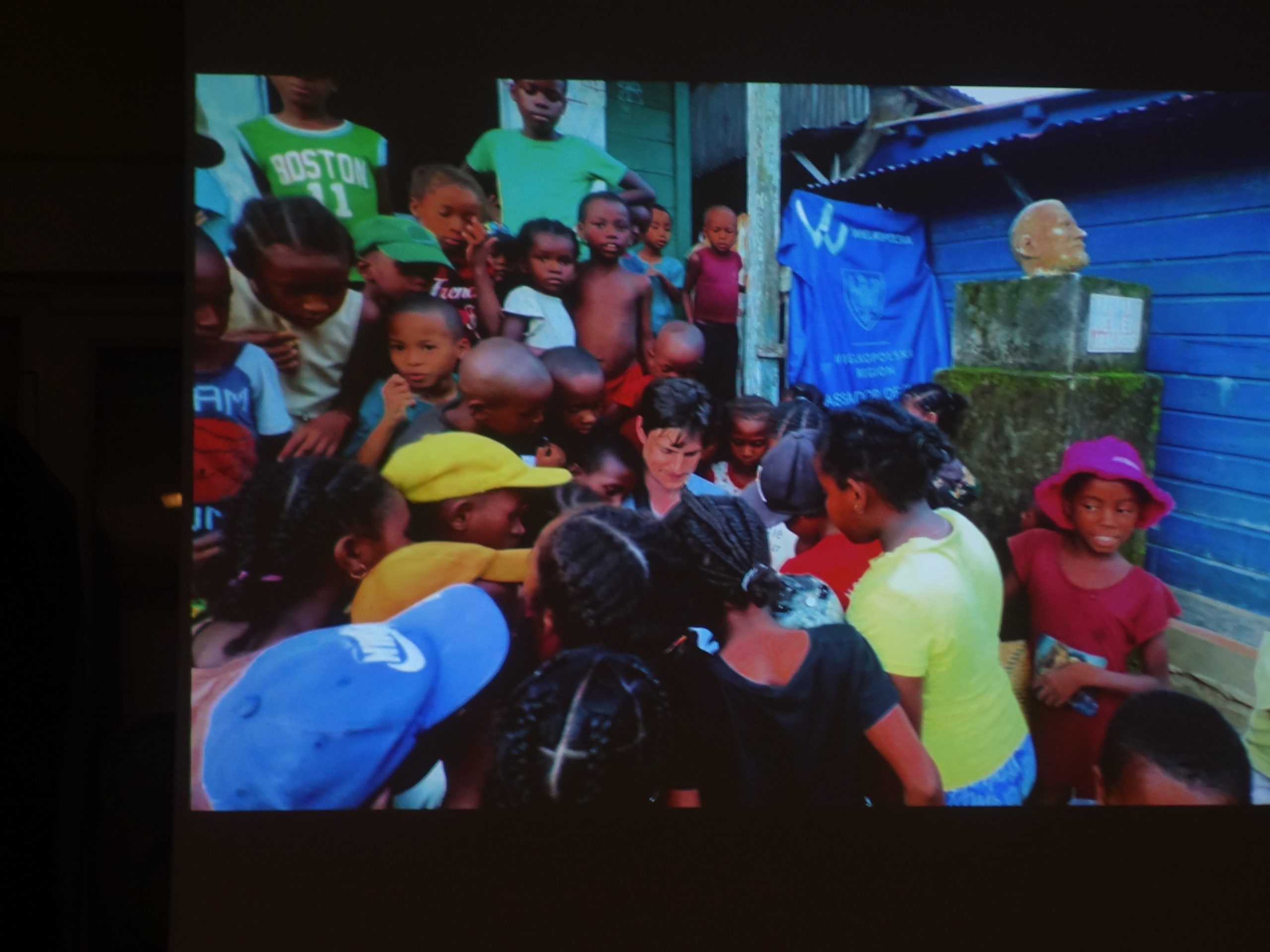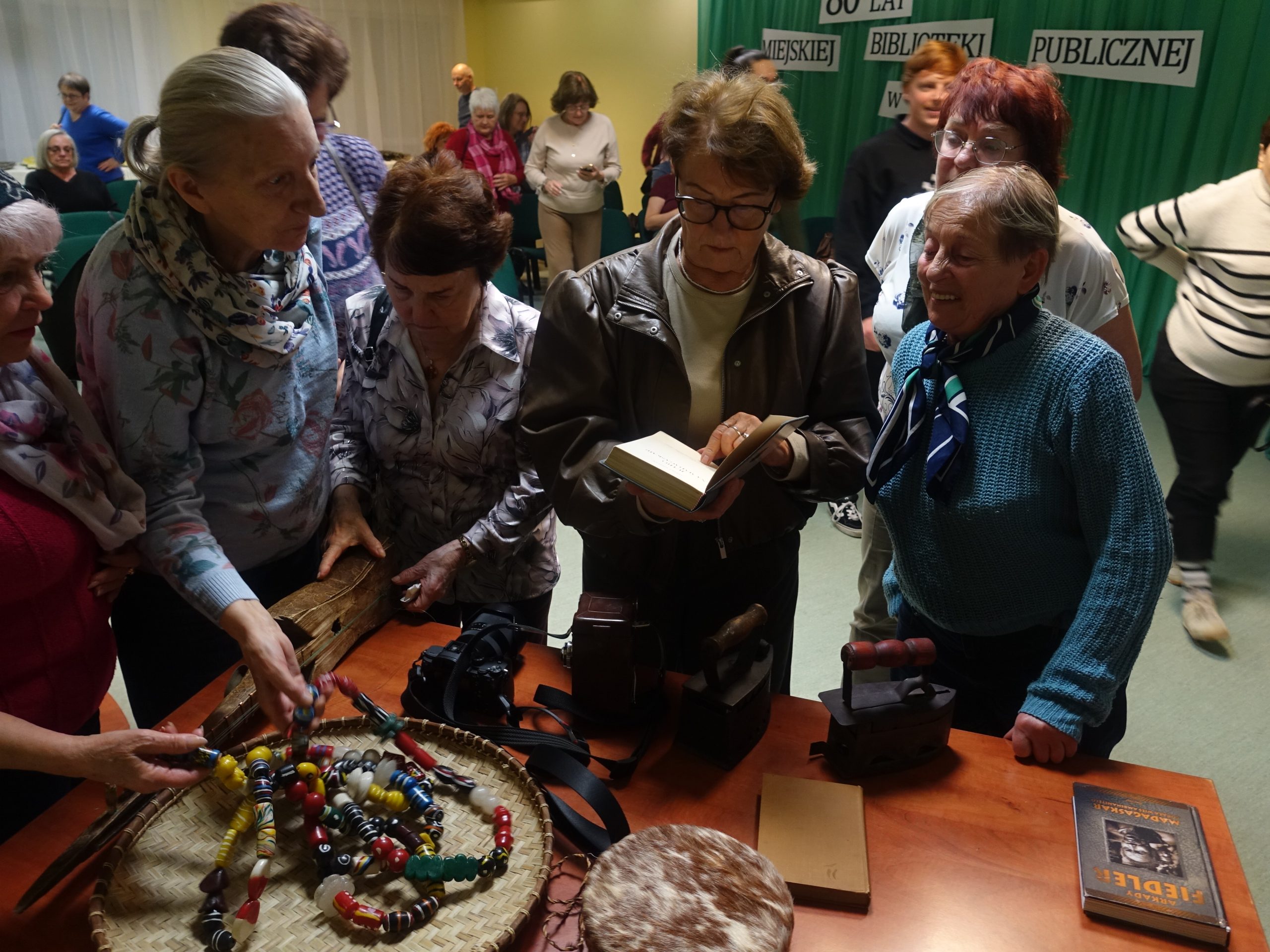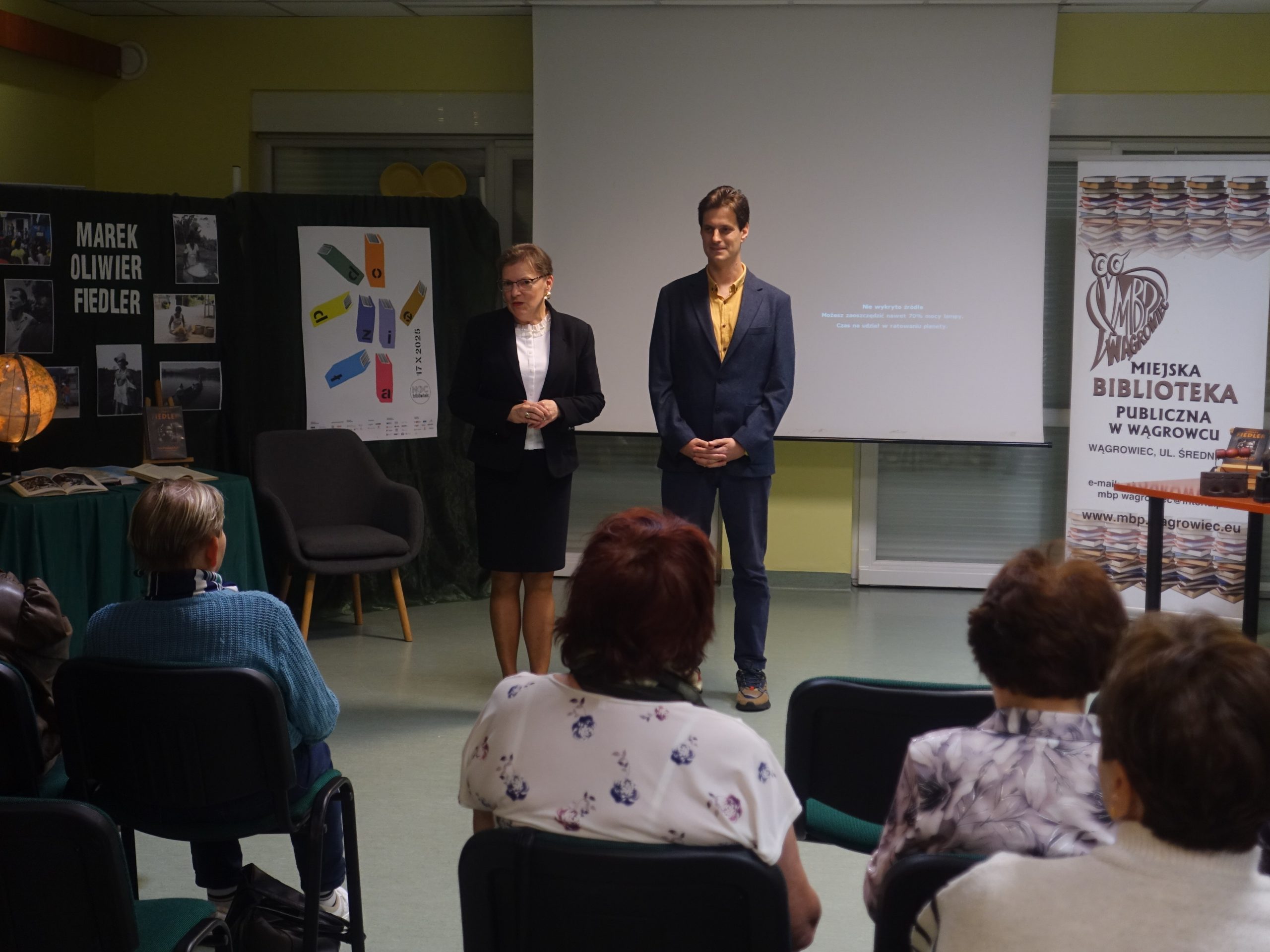 W ramach obchodów 11. Edycji NOCY BIBLIOTEK pod hasłem: DO DZIEŁA! Nasza biblioteka gościła Marka Oliwiera Fiedlera, wnuka podróżnika Arkadego Fiedlera, pomysłodawcy i jednego z założycieli Muzeum Pracownia Literacka Arkadego Fiedlera w Puszczykowie. Marek O. Fiedler z wykształcenia jest antropologiem kulturowym, fotografem i muzealnikiem, a jego pasją są: film, dziennikarstwo oraz podróże. Podczas spotkania nasz gość zaprezentował serię krótkich filmów ze swojej wyprawy na Madagaskar szlakiem dziadka Arkadego, którą odbył wraz ze swoją żoną Stefanią. Prezentowane filmy powstały przy użyciu drona, który wzbudził niemałe zaciekawienie wśród tamtejszej ludności. Celem wyprawy było odwiedzenie góry, fortu hrabiego Maurycego Beniowskiego na Madagaskarze, których to miejsc dziadkowi pana Marka nie udało się odnaleźć. Znacznie później odnalazł je Albert Zięba Polak mieszkający na Madagaskarze. W trakcie wspinaczki na górę naszemu gościowi oraz jego żonie towarzyszyła grupa mieszkańców, głównie dzieci wraz z burmistrzem Mariaranu, miejscowości odległej o około 6 km od Ambinanitelo. Z góry rozpościerał się piękny widok na rozległe doliny. Pomnik Arkadego Fiedlera – dziadka znajduje się w centralnym punkcie miejscowości Ambinanitelo. Centrum życia w madagaskarskich wioskach odbywa się nad zatoką, tam ludzie się myją, piorą i łowią ryby. Tamtejsza kultura i rękodzieło zanikają na rzecz kultu europejskich przedmiotów. Ciekawostką, jaką przywiózł podróżnik z wyprawy są korale, które szaman wykonał przetapiając plastikowe butelki. Po tygodniowym pobycie na Madagaskarze pan Marek zauważa, że „Czas płynie, ale duch miejsca nadal trwa”. Po zakończeniu seansu był czas na rozmowy z naszym gościem przy filiżance herbaty i słodkościach, wspólne zdjęcia oraz podziwianie przywiezionych pamiątek.