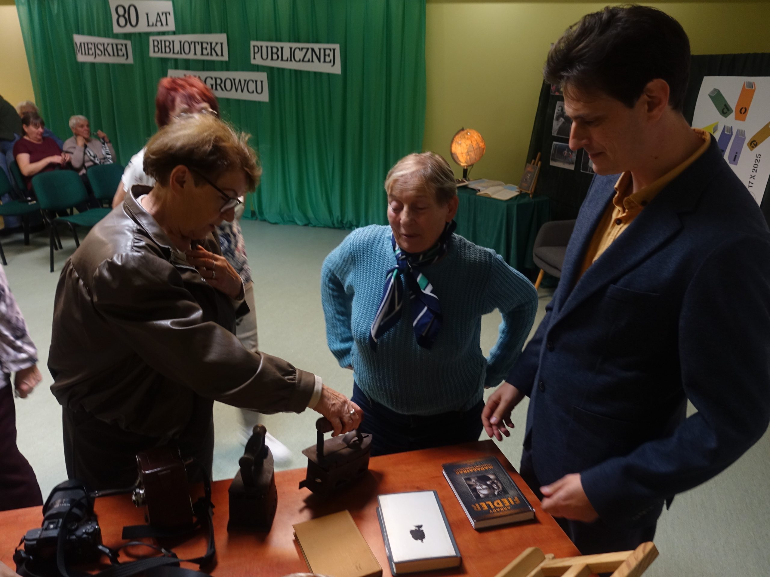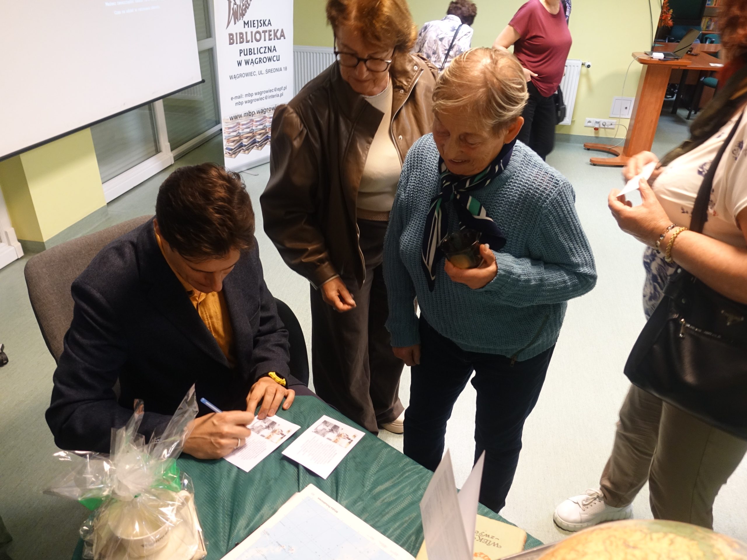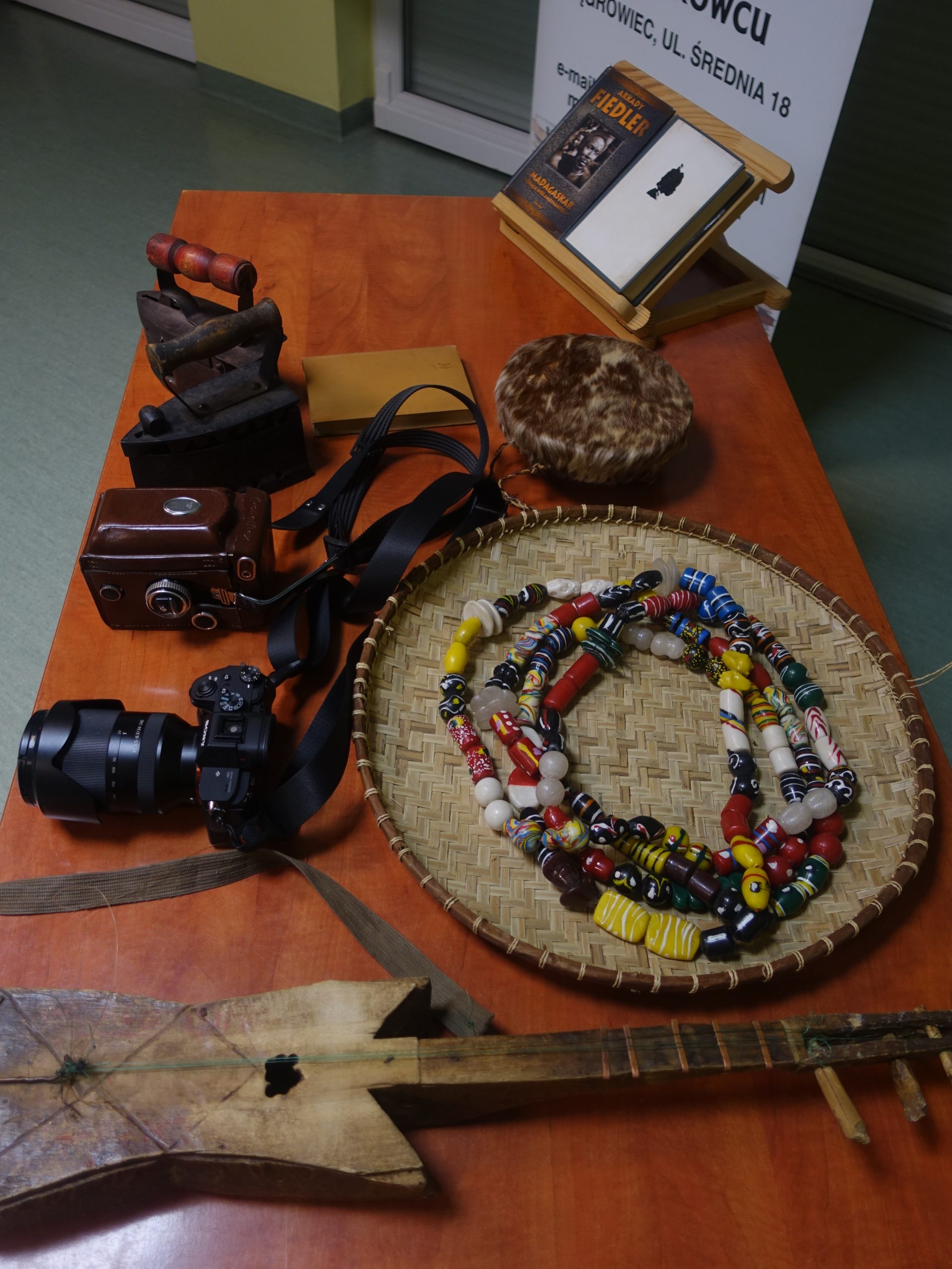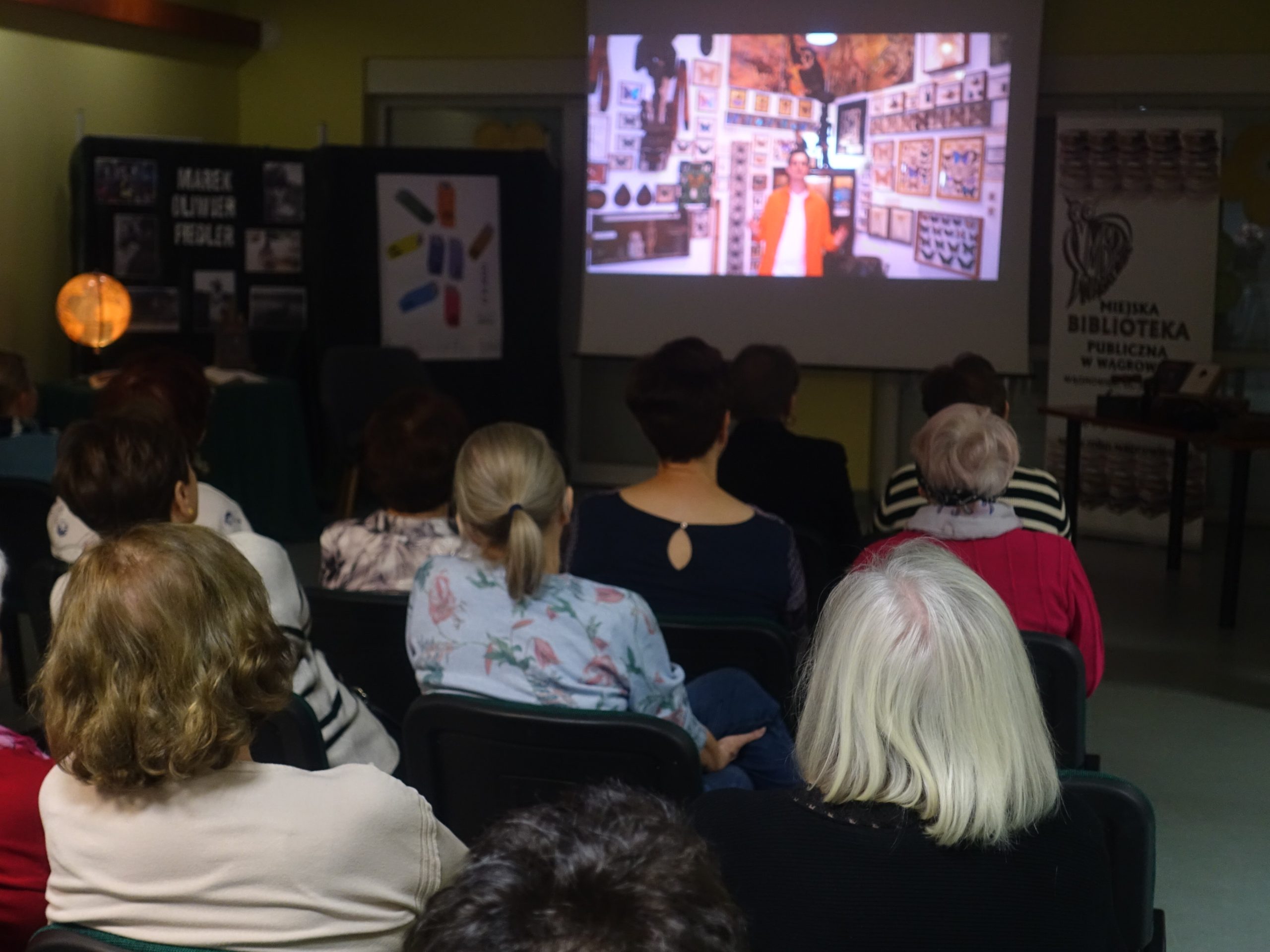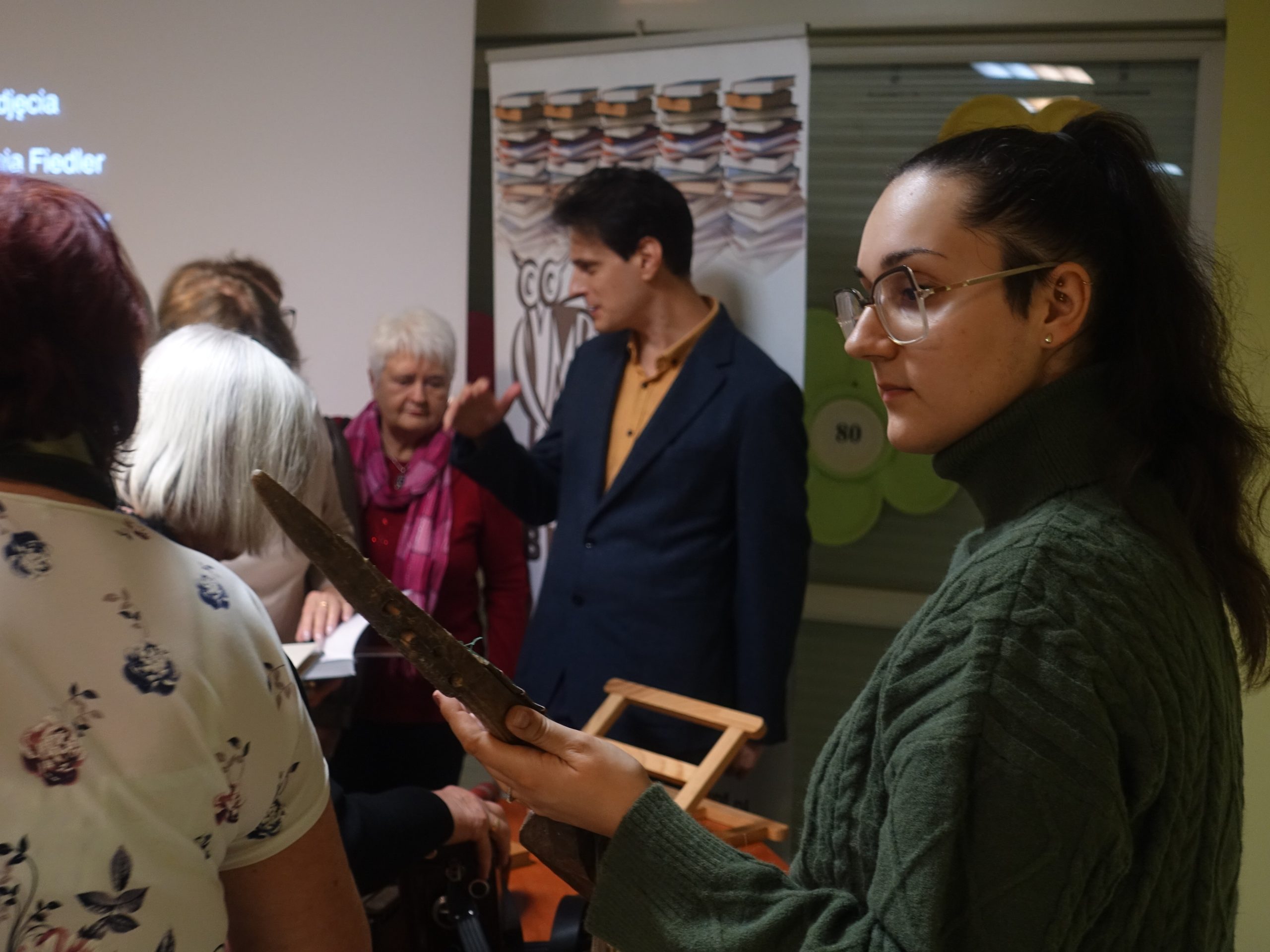 W ramach obchodów 11. Edycji NOCY BIBLIOTEK pod hasłem: DO DZIEŁA! Nasza biblioteka gościła Marka Oliwiera Fiedlera, wnuka podróżnika Arkadego Fiedlera, pomysłodawcy i jednego z założycieli Muzeum Pracownia Literacka Arkadego Fiedlera w Puszczykowie. Marek O. Fiedler z wykształcenia jest antropologiem kulturowym, fotografem i muzealnikiem, a jego pasją są: film, dziennikarstwo oraz podróże. Podczas spotkania nasz gość zaprezentował serię krótkich filmów ze swojej wyprawy na Madagaskar szlakiem dziadka Arkadego, którą odbył wraz ze swoją żoną Stefanią. Prezentowane filmy powstały przy użyciu drona, który wzbudził niemałe zaciekawienie wśród tamtejszej ludności. Celem wyprawy było odwiedzenie góry, fortu hrabiego Maurycego Beniowskiego na Madagaskarze, których to miejsc dziadkowi pana Marka nie udało się odnaleźć. Znacznie później odnalazł je Albert Zięba Polak mieszkający na Madagaskarze. W trakcie wspinaczki na górę naszemu gościowi oraz jego żonie towarzyszyła grupa mieszkańców, głównie dzieci wraz z burmistrzem Mariaranu, miejscowości odległej o około 6 km od Ambinanitelo. Z góry rozpościerał się piękny widok na rozległe doliny. Pomnik Arkadego Fiedlera – dziadka znajduje się w centralnym punkcie miejscowości Ambinanitelo. Centrum życia w madagaskarskich wioskach odbywa się nad zatoką, tam ludzie się myją, piorą i łowią ryby. Tamtejsza kultura i rękodzieło zanikają na rzecz kultu europejskich przedmiotów. Ciekawostką, jaką przywiózł podróżnik z wyprawy są korale, które szaman wykonał przetapiając plastikowe butelki. Po tygodniowym pobycie na Madagaskarze pan Marek zauważa, że „Czas płynie, ale duch miejsca nadal trwa”. Po zakończeniu seansu był czas na rozmowy z naszym gościem przy filiżance herbaty i słodkościach, wspólne zdjęcia oraz podziwianie przywiezionych pamiątek.