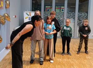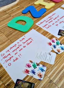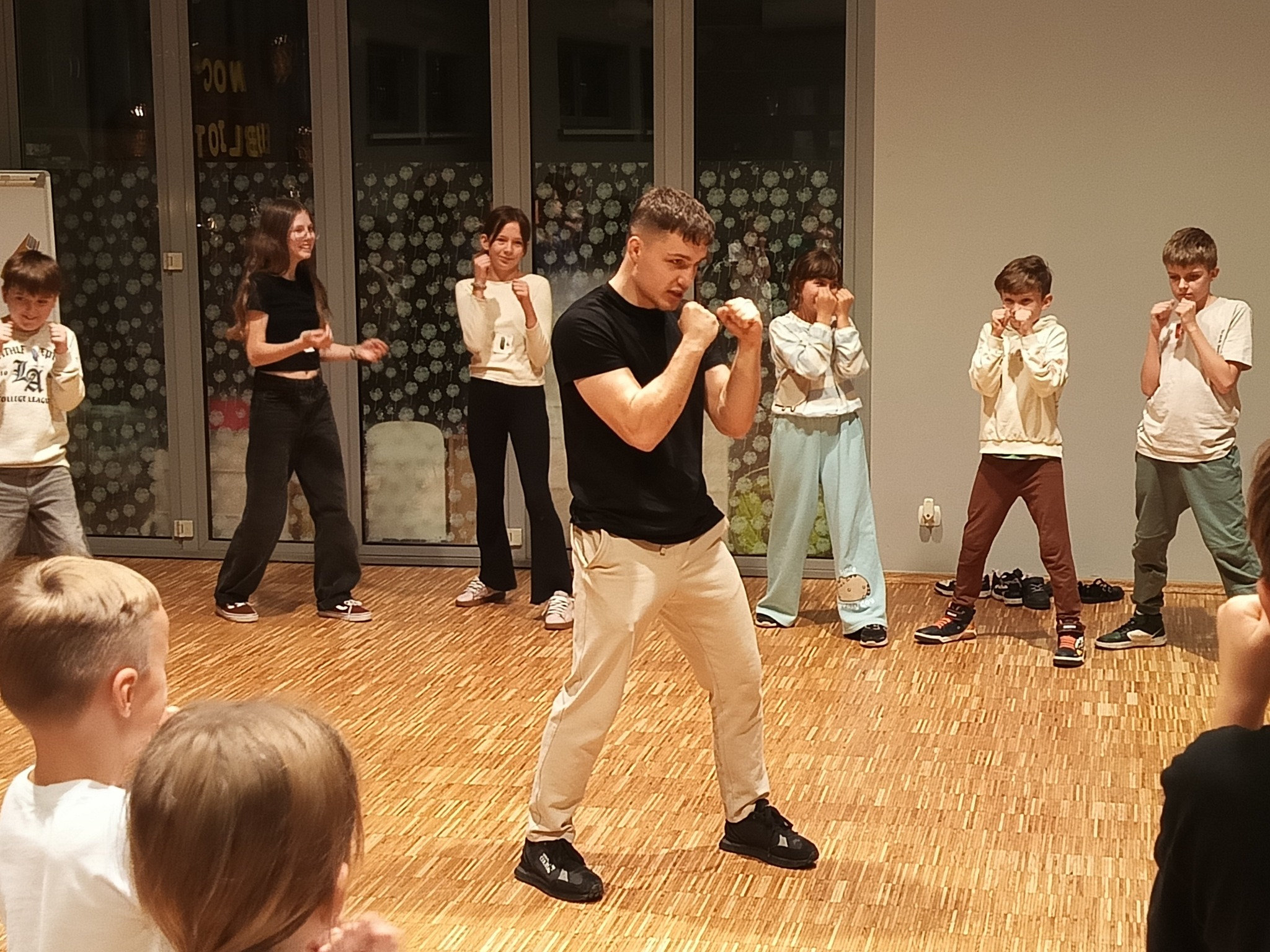 Okrzykiem "DO DZIEŁA!" rozpoczęliśmy rozgrzewkę. Trener nauczył nas jak przyjąć prawidłową postawę bokserską, jak się bronić i wykonywać uniki. Oj DZIAŁO SIĘ dużo – ale bezpiecznie i z uśmiechem :)