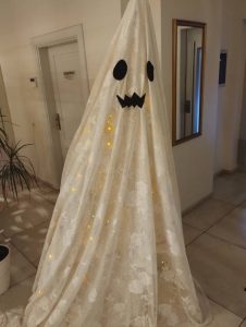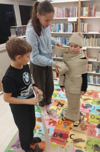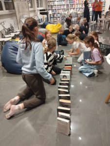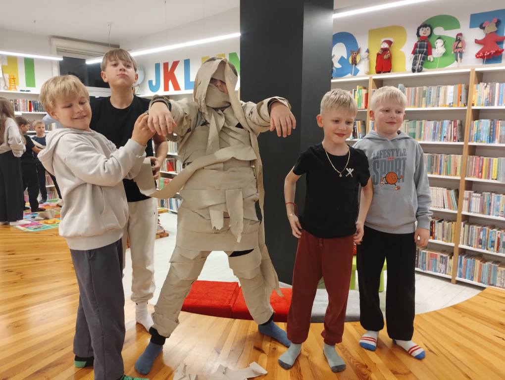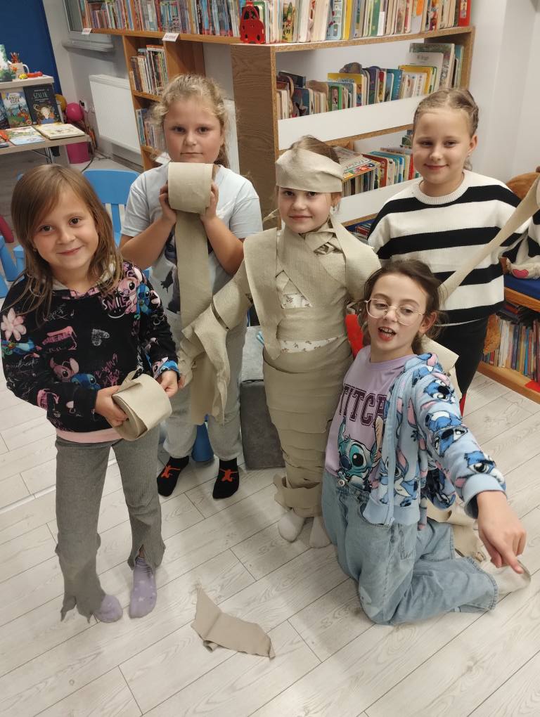 Uczestnicy z zapałem szukali kasztanów ukrytych między bibliotecznymi regałami📚, rywalizowali w konkursie na najlepszą mumię, budowali domino z książek oraz rozwiązywali różnorodne zadania – od tanecznych wyzwań, przez sportowe, aż po poszukiwania konkretnych tytułów na półkach.