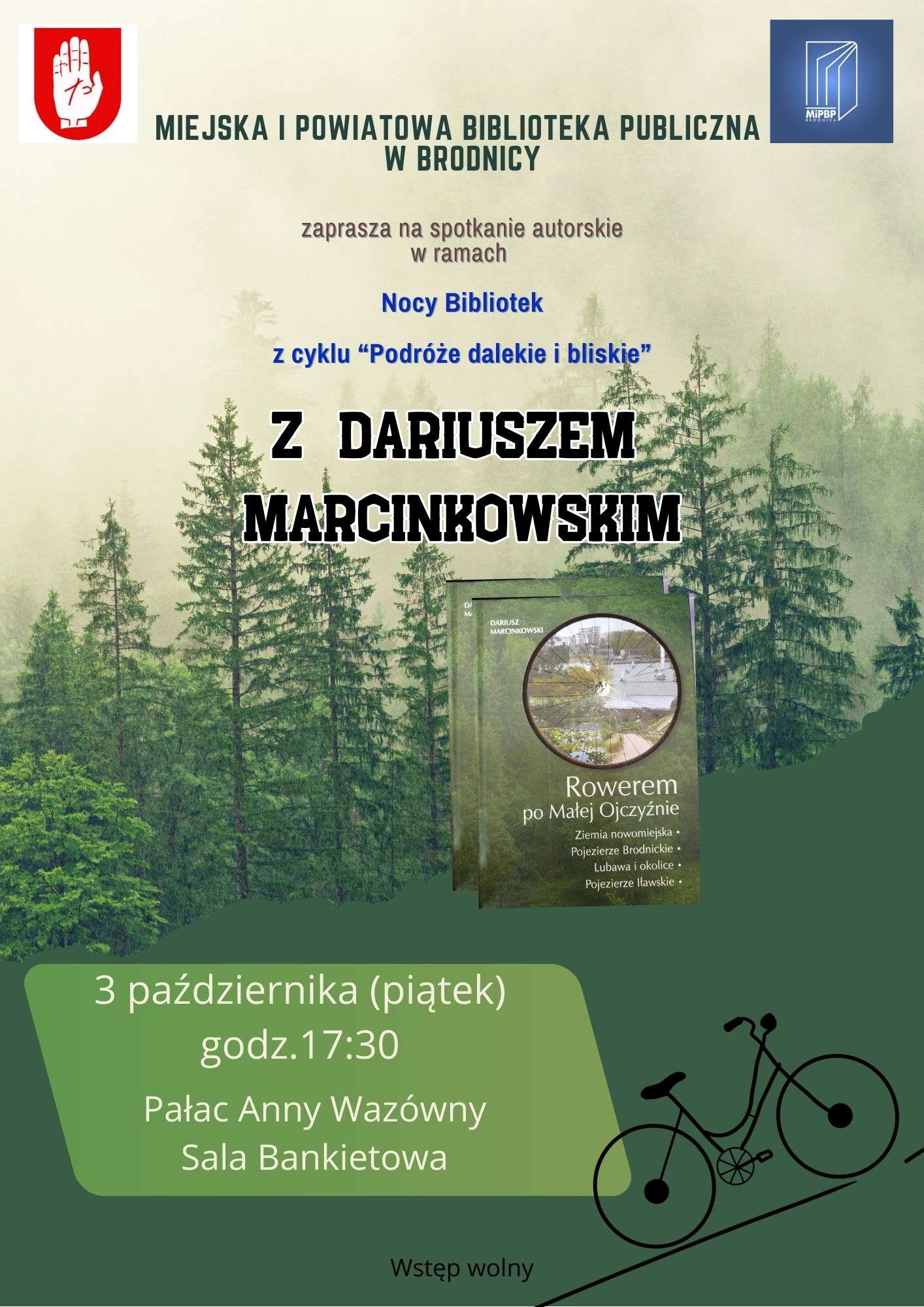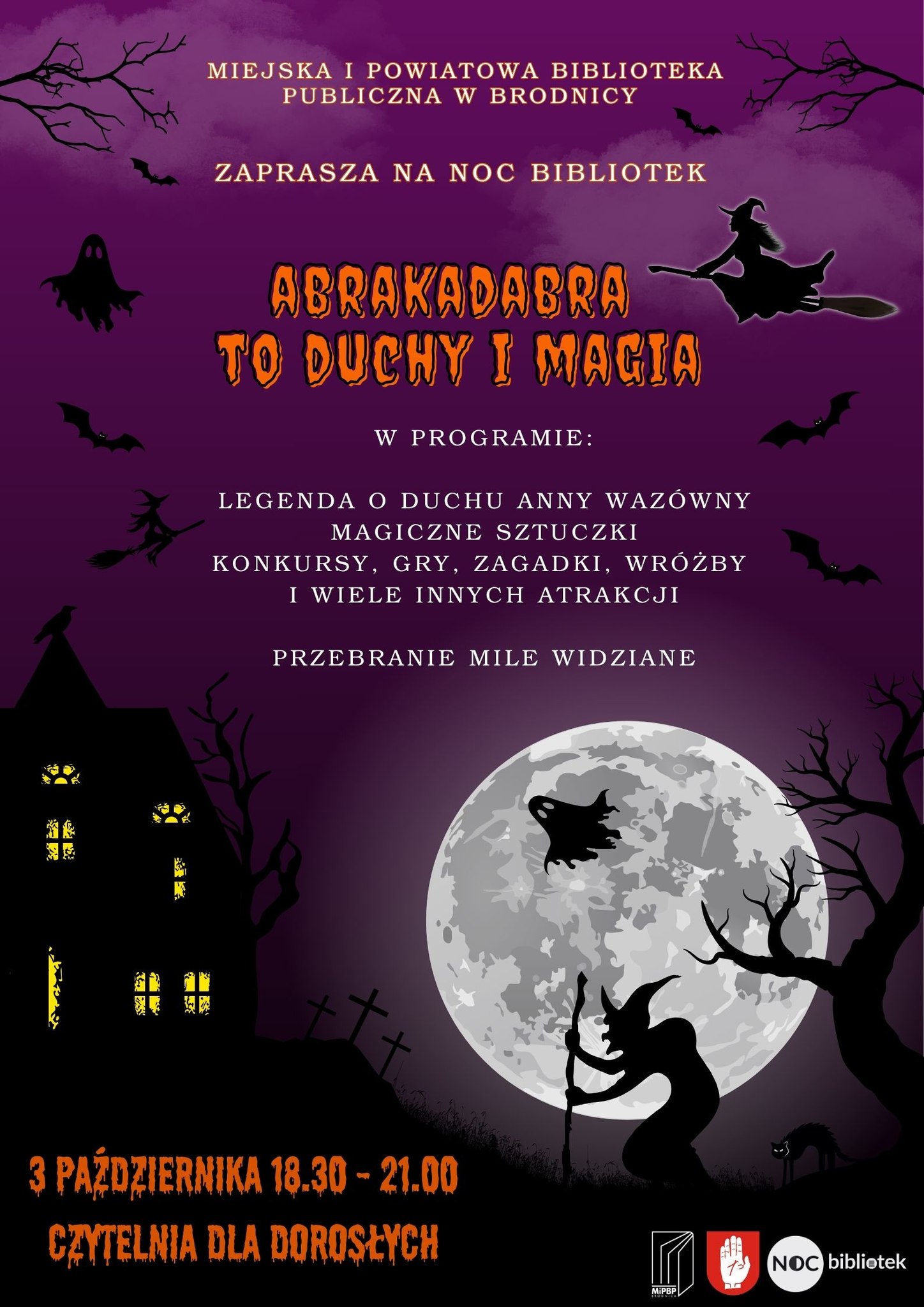 Miejska i Powiatowa Biblioteka Publiczna w Brodnicy serdecznie zaprasza na XI Ogólnopolską Noc Bibliotek, która odbędzie się 3 października br. w godzinach 17:30–21:00 pod hasłem „Do dzieła”. W programie przewidziano spotkanie autorskie z Dariuszem Marcinkowskim promujące książkę „Rowerem po Małej Ojczyźnie” w ramach cyklu „Podróże dalekie i bliskie”, zajęcia dla dzieci w czytelni pt. „ABRAKADABRA – Duchy i Magia” oraz prelekcję „Tryptyk z Anną Wazówną”, obejmującą trzy części: „U rodziców Anny Wazówny”, „Wiara Anny Wazówny” oraz „Anna Wazówna – prekursorka polskiego ziołolecznictwa”. W trakcie wydarzenia odbędzie się także kiermasz taniej książki, oraz biblioteka ogłasza amnestię dla osób przetrzymujących wypożyczone publikacje. Serdecznie zapraszamy!