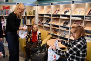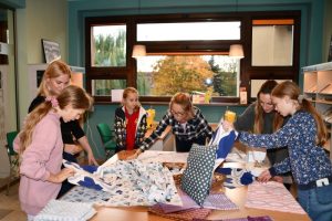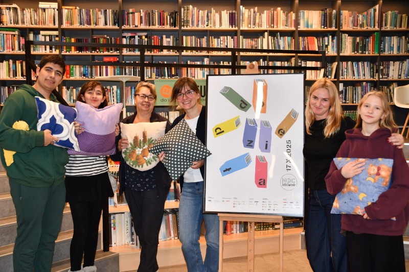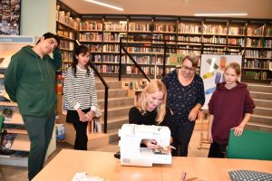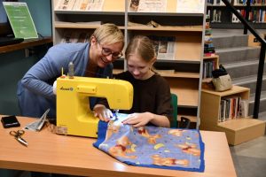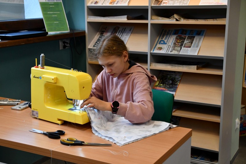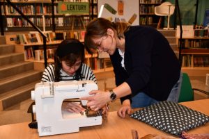 W tym samym czasie, w czytelni biblioteki, rozbrzmiewał stukot igieł i śmiech uczestników warsztatów szycia. Uczestnicy warsztatów dali się ponieść wyobraźni i pod okiem instruktorek tworzyli kolorowe jaśki. Radość tworzenia wyczuwalna była w każdym zakątku czytelni.