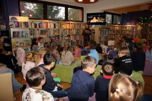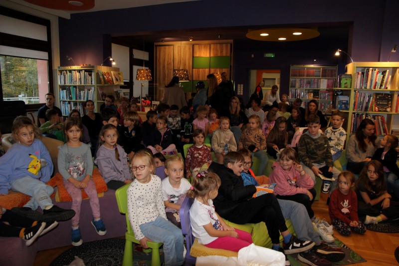 Wieczór rozpoczął się w Strefie Koloru, gdzie odbyła się projekcja pełnego przygód filmu dla dzieci pt. Biuro Detektywistyczne Lassego i Mai. Rabuś z pociągu. Mali detektywi z entuzjazmem śledzili losy bohaterów, a wspólne oglądanie filmu w bibliotecznej przestrzeni stworzyło prawdziwie kinową atmosferę.