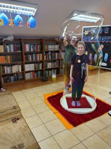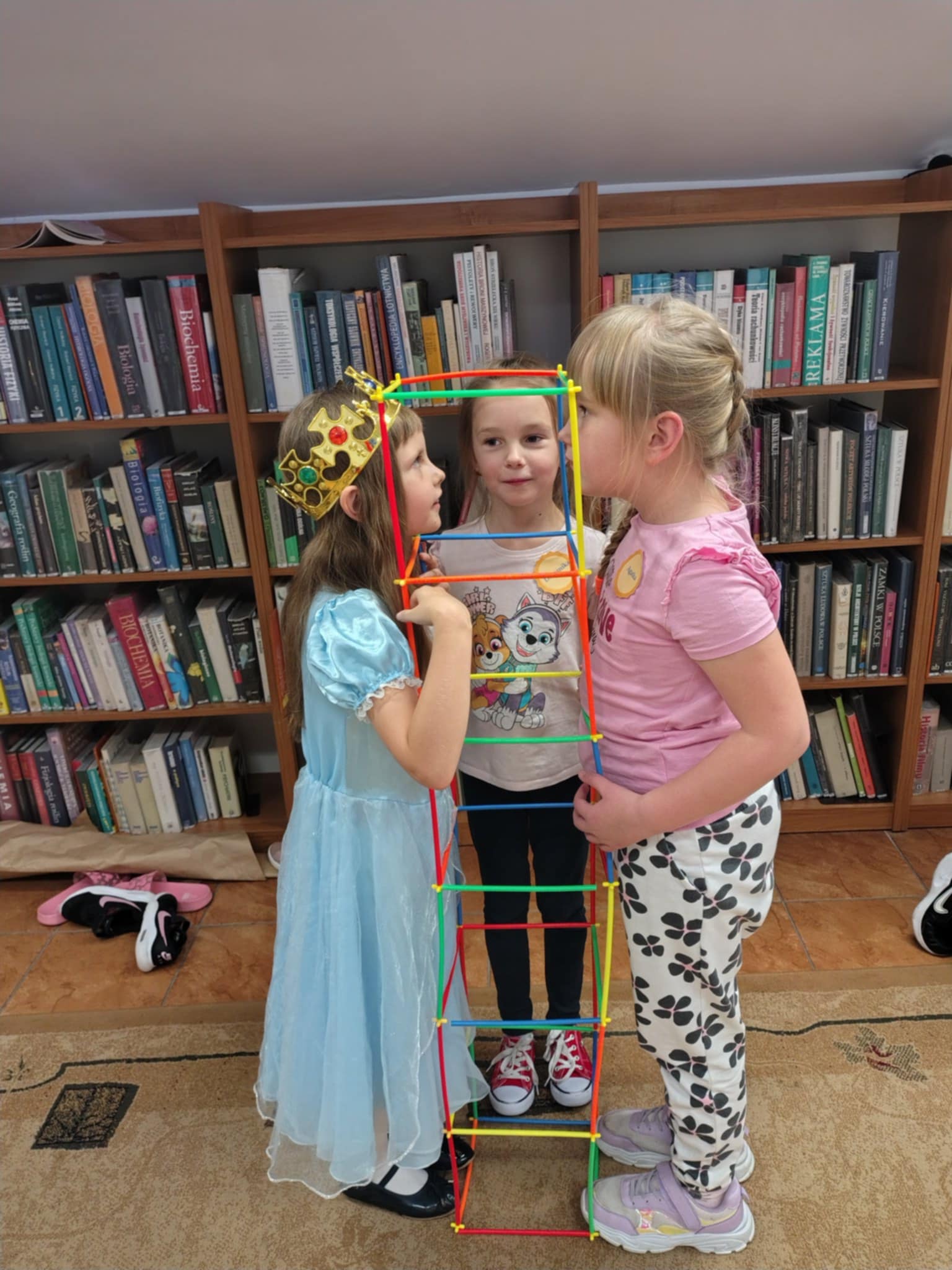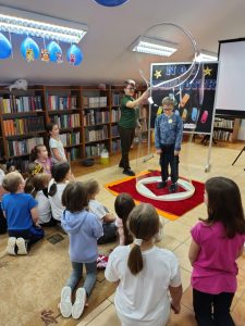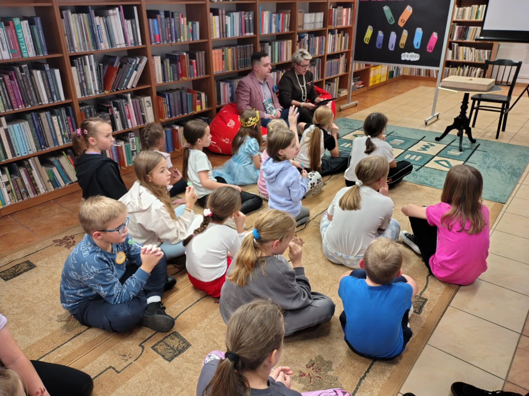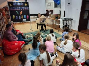 Nie zabrakło również bajkowych historii – dzieci z zainteresowaniem wysłuchały opowieści pt. „Noc w bibliotece”, w której bohaterowie pomagają zagubionemu krasnoludkowi odnaleźć drogę do jego bajki. Historia pełna ciepła i humoru pokazała, jak ważne są przyjaźń, odwaga i współpraca.