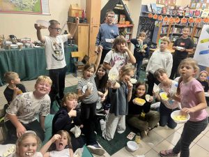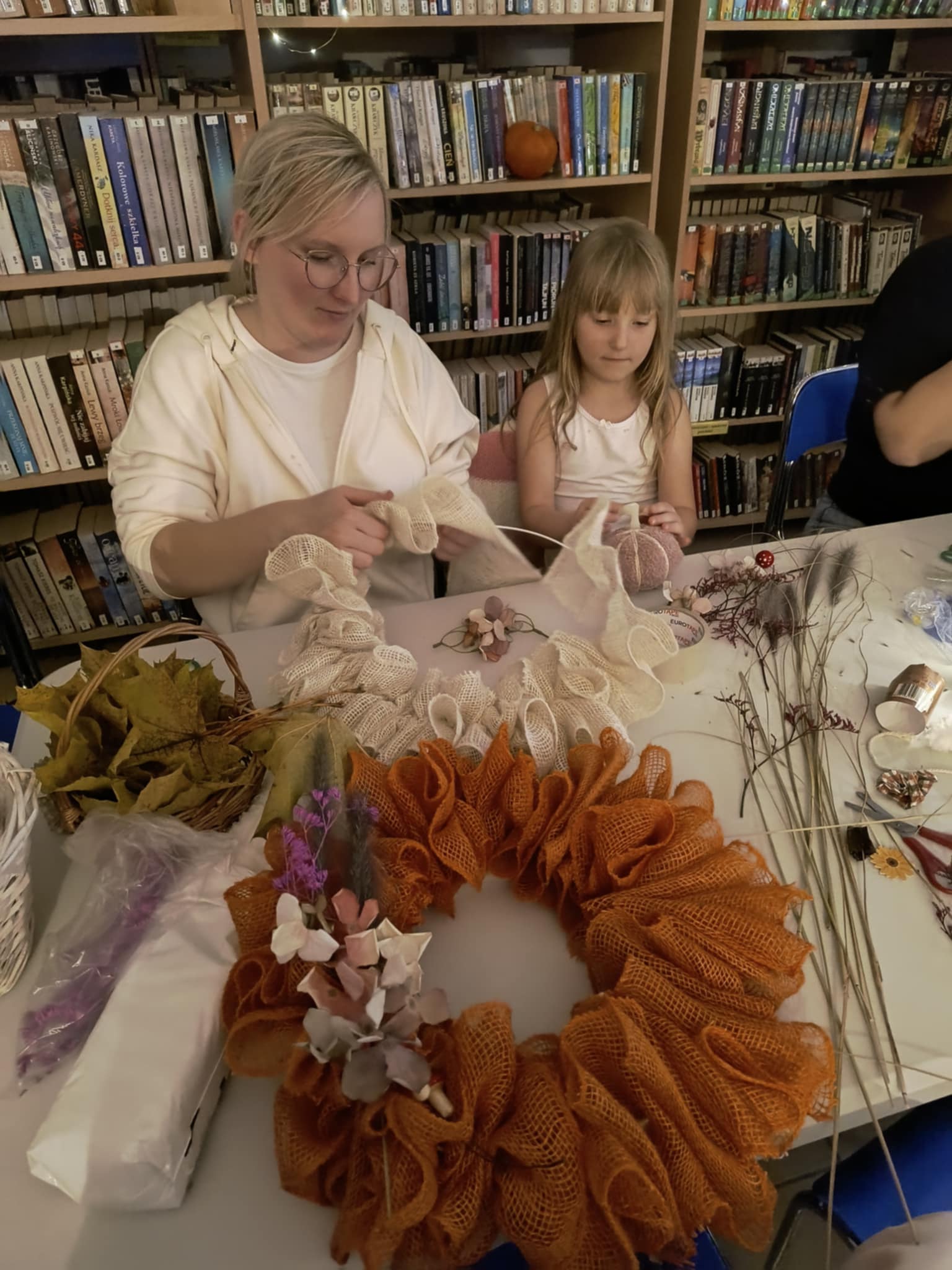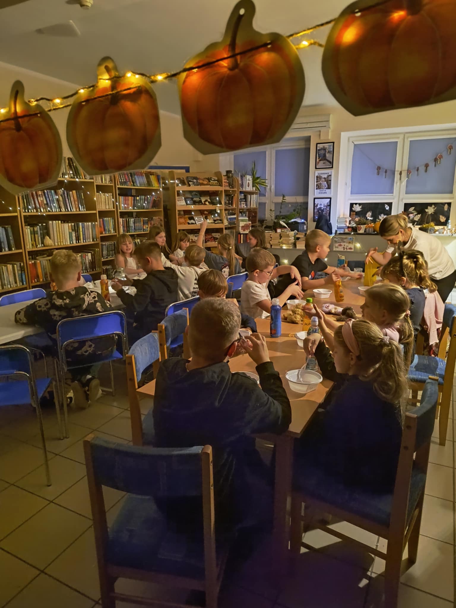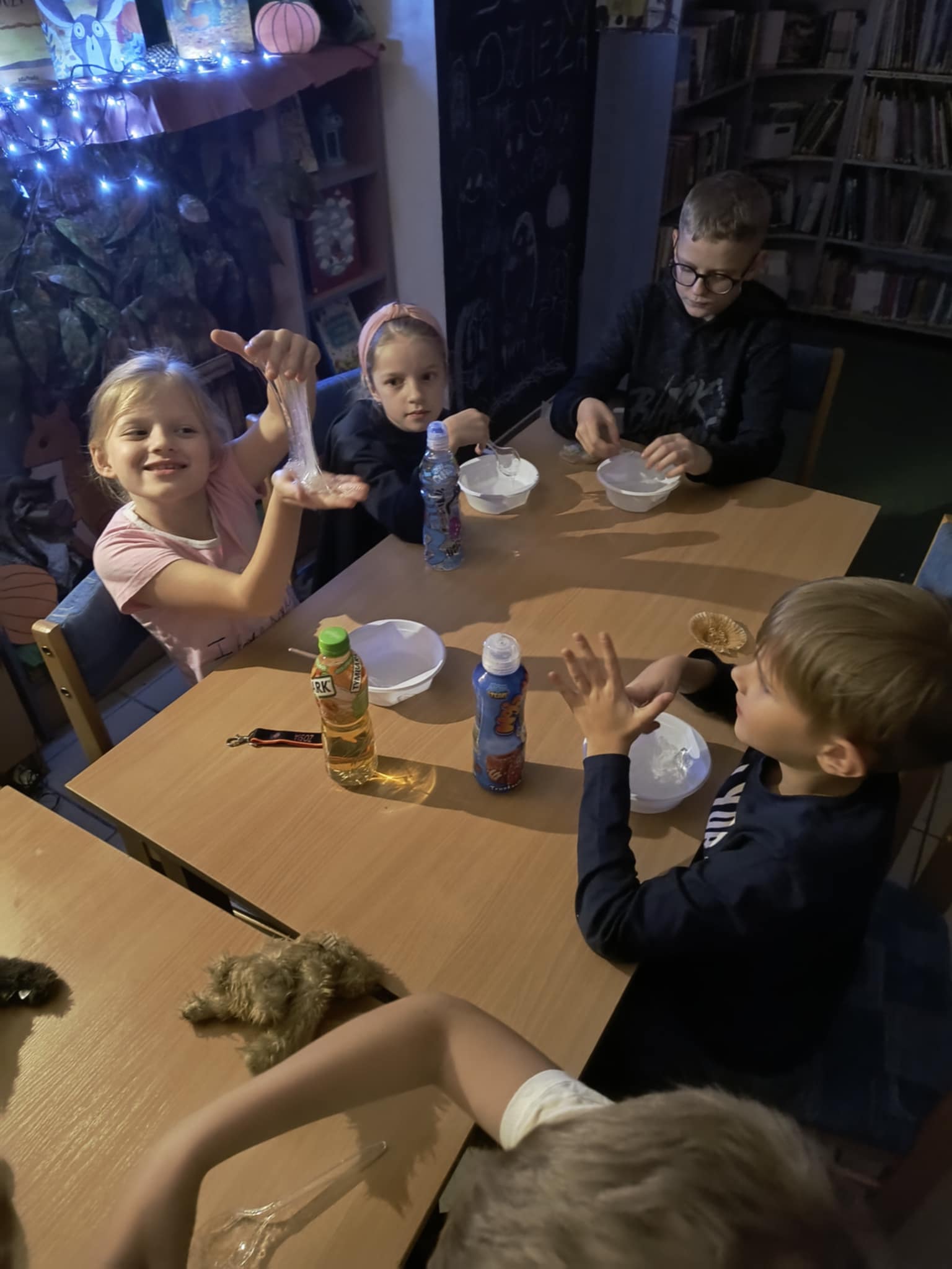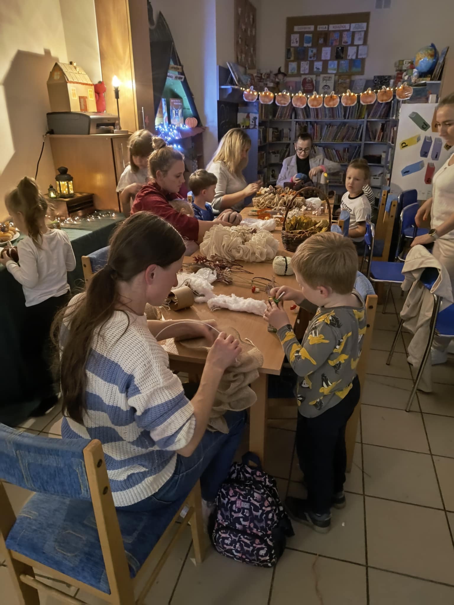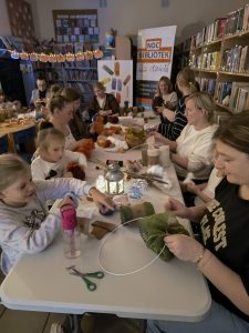 Na rodzinnych warsztatach powstały piękne jesienne ozdoby. Było też trochę magii — slimy świecące w ciemności, które zachwyciły naszych uczestników! A na zakończenie — seans filmowy z popcornem. Bo biblioteka to nie tylko książki – to także przestrzeń do działania, zabawy i integracji!