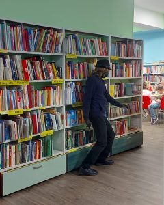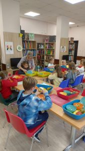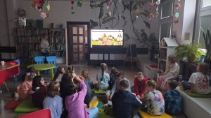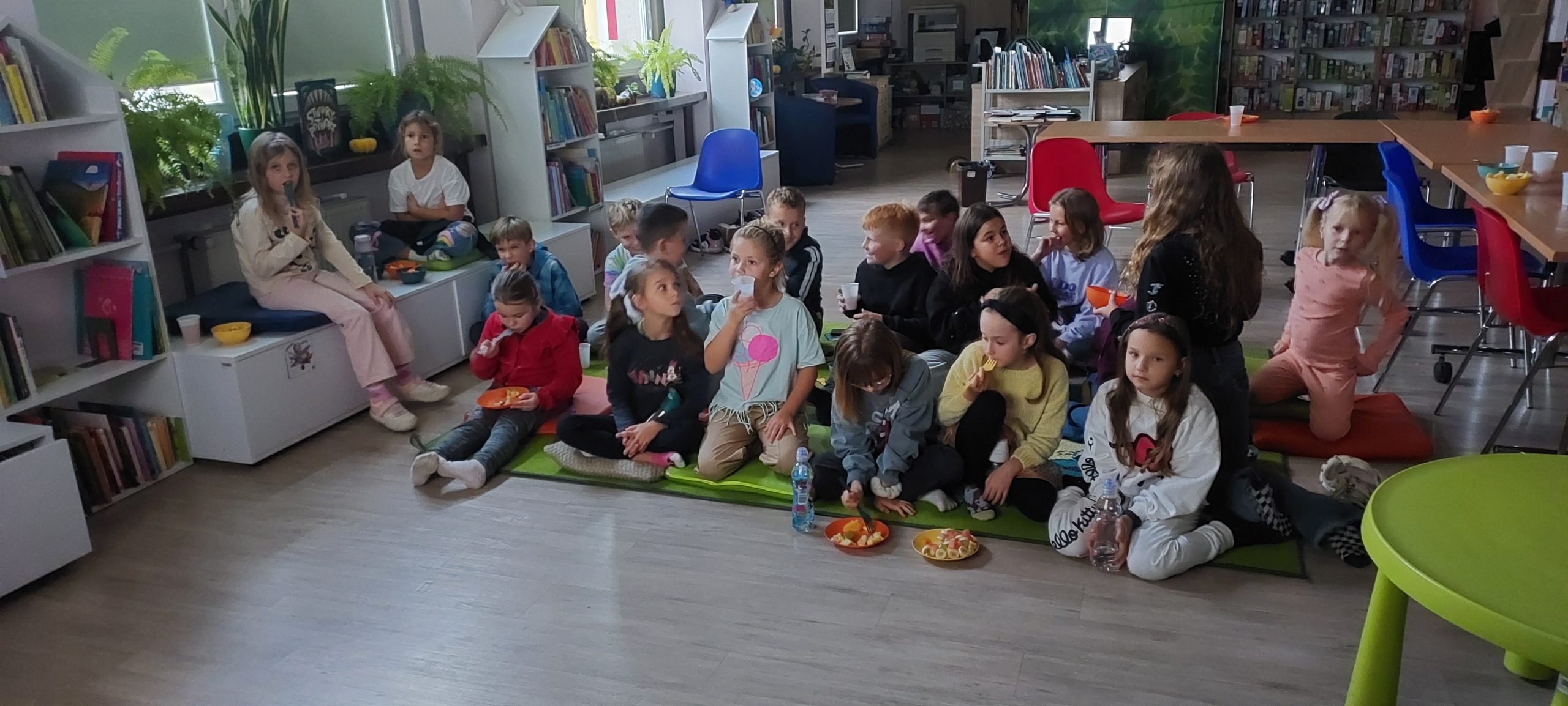 Dział Dziecięcy Filii również przygotował moc atrakcji! Tego wieczora dzieci wzięły udział w warsztatach kulinarnych, przygotowując pyszna owocowa sałatką, którą pałaszowały podczas projekcji filmu „Biuro detektywistyczne Lassego i Mai. Rabuś z pociągu” , który był tegoroczną propozycją Nocy Bibliotek, opartą na bestsellerowych książkach Martina Widmarka. Na koniec wydarzenia uczestnicy spotkania mieli za zadanie odnaleźć książki detektywistyczne, ukryte w bibliotecznych zakamarkach.