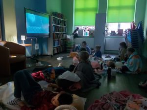 Emocje sięgnęły zenitu, kiedy niespodziewanie wdarł się do nas nieznany osobnik, który ukradł nam portfel i cenną figurkę!!! Na szczęście szybko go odszukaliśmy i odzyskaliśmy nasze przedmioty. Nagrodą za świetnie przeprowadzone śledztwo były znalezione wśród książek malowane kamienie oraz udział w projekcji filmu „Rabuś z pociągu” na podstawie książki z serii Biuro Detektywistyczne Lassego i Mai Martina Widmarka, umilony chrupaniem pysznego domowego popcornu. Emocje i smaki tej nocy na pewno pozostaną na długo wraz młodymi czytelnikami.