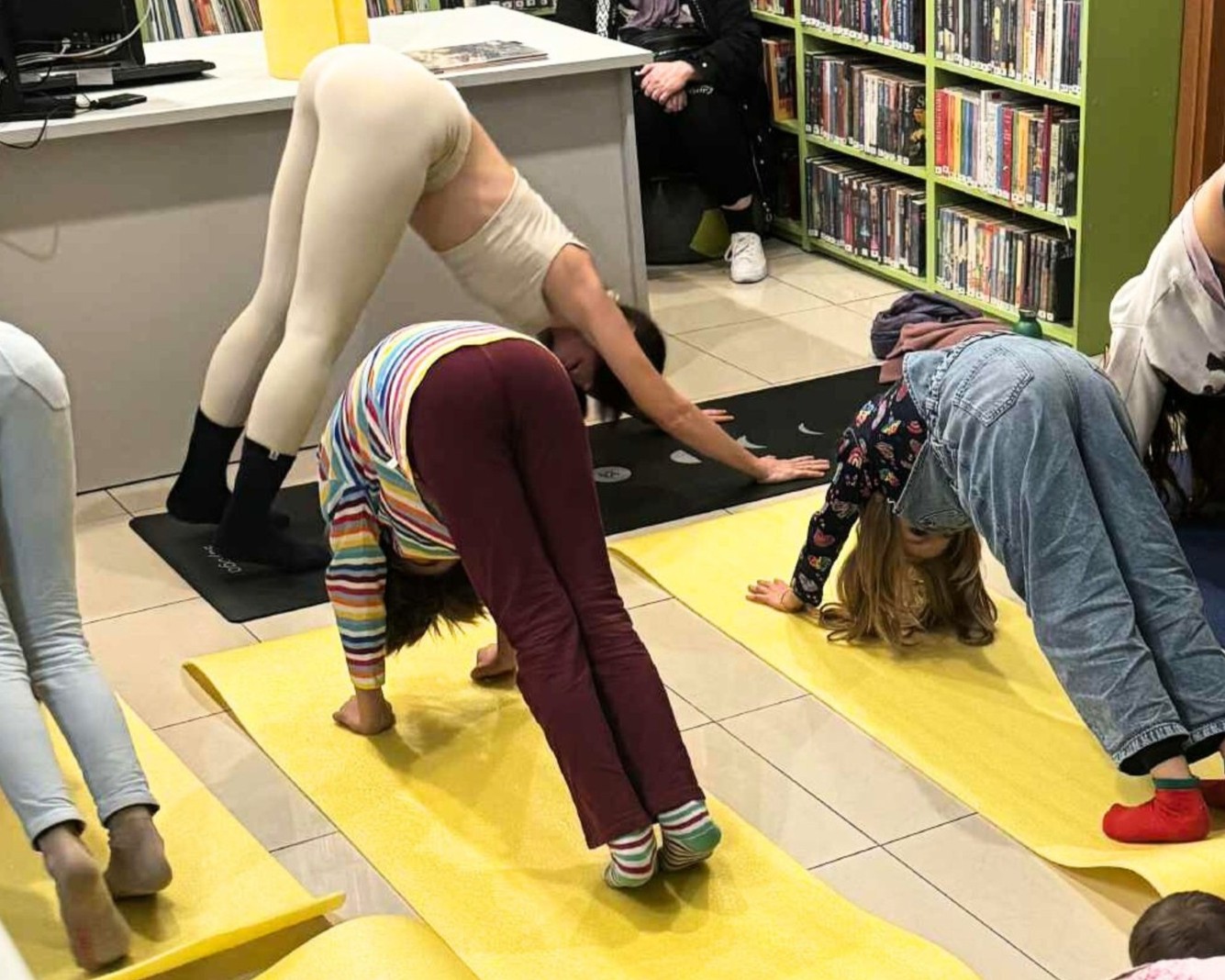 Po zamknięciu placówki pani Ewelina Gutkowska, certyfikowana trenerka jogi, zrzeszona z Yoga Alliance, poprowadziła u nas jogę i relaksację dla dzieci. Zajęcia były na zapisy ze względu na ograniczoną przestrzeń naszej biblioteki, ale wyszły wysmienicie. Miały tytuł DO DZIEŁA, MALI JOGINI. PODRÓŻ DO ŚWIATA JOGI W BIBLIOTECE.