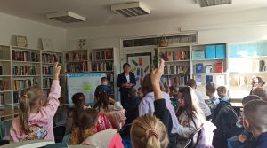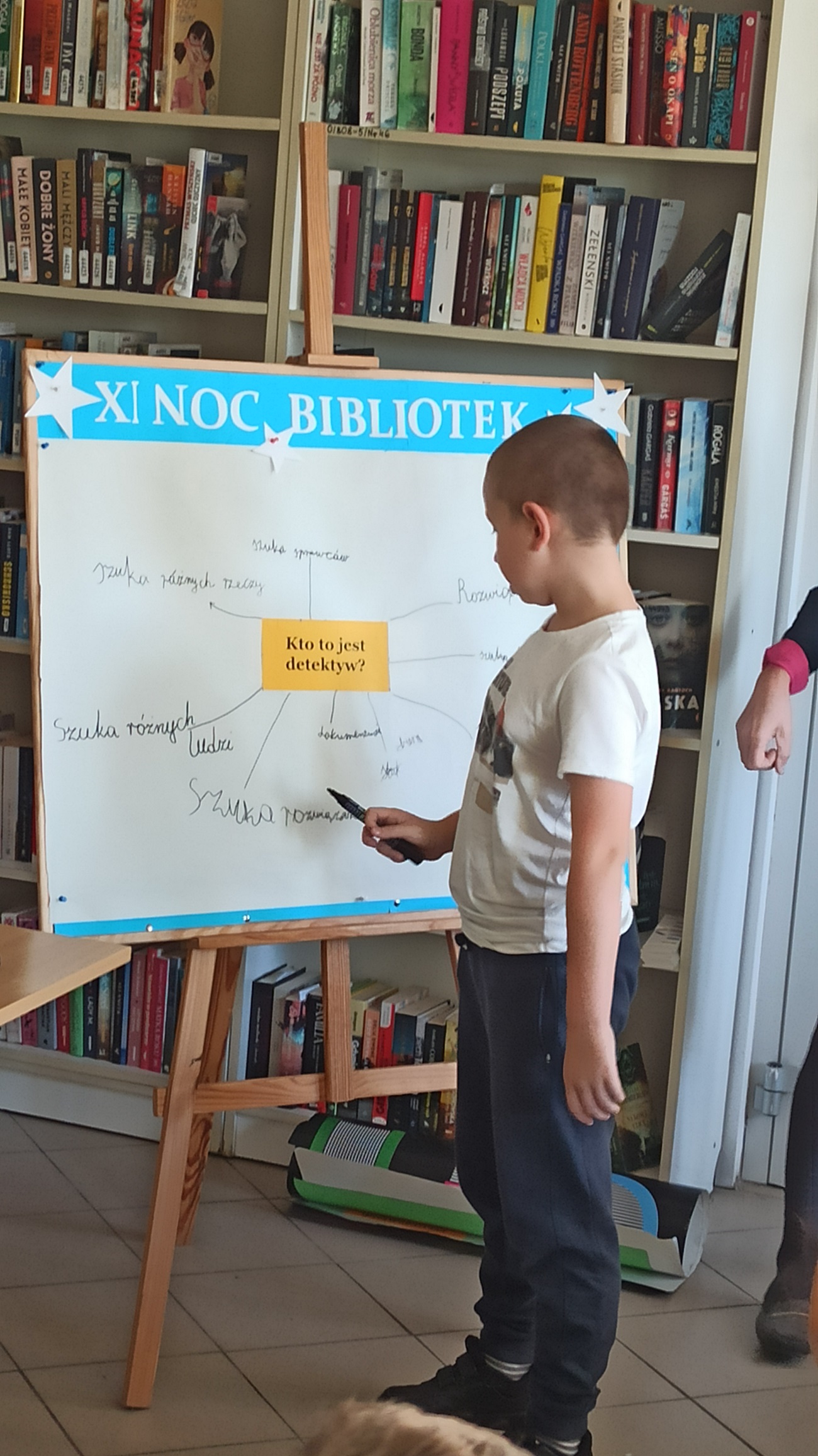 4. "Tropem złodzieja książki" - poszukiwanie złodzieja bezcennej książki, skradzionej w nocy w buskiej bibliotece, na podstawie śladów pozostawionych przez sprawcę. Warsztaty detektywistyczne, podczas których uczniowie zbierali ślady z miejsca przestępstwa, pozostawione przez złodzieja: odcisk buta, guzik, odcisk palca na szklance, a następnie z wykorzystaniem zestawu młodego detektywa: lupy, pędzelka i proszku daktyloskopijnego, poduszki z tuszem, taśmy, porównywali je ze śladami butów i odciskami palców czytelników.