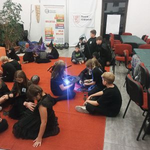 Kolejną grupową zabawą była nasza autorska kombinacja, nazwana "Babą Jagą Patrzącą z Ziemniaka", w której refleks, kreatywne odpowiedzi na pytania oraz łut szczęścia stanowiły przepis na sukces. Ci, którzy odpadli, w oczekiwaniu na wyłonienie zwycięzców, rozwiązywali przy stole wykreślanki tematyczne ze świata Harry'ego Pottera.