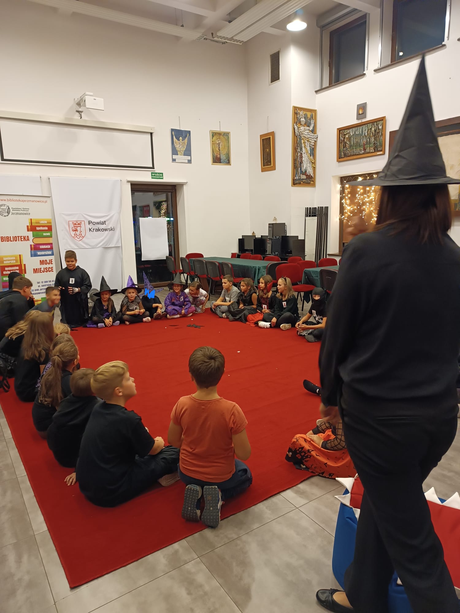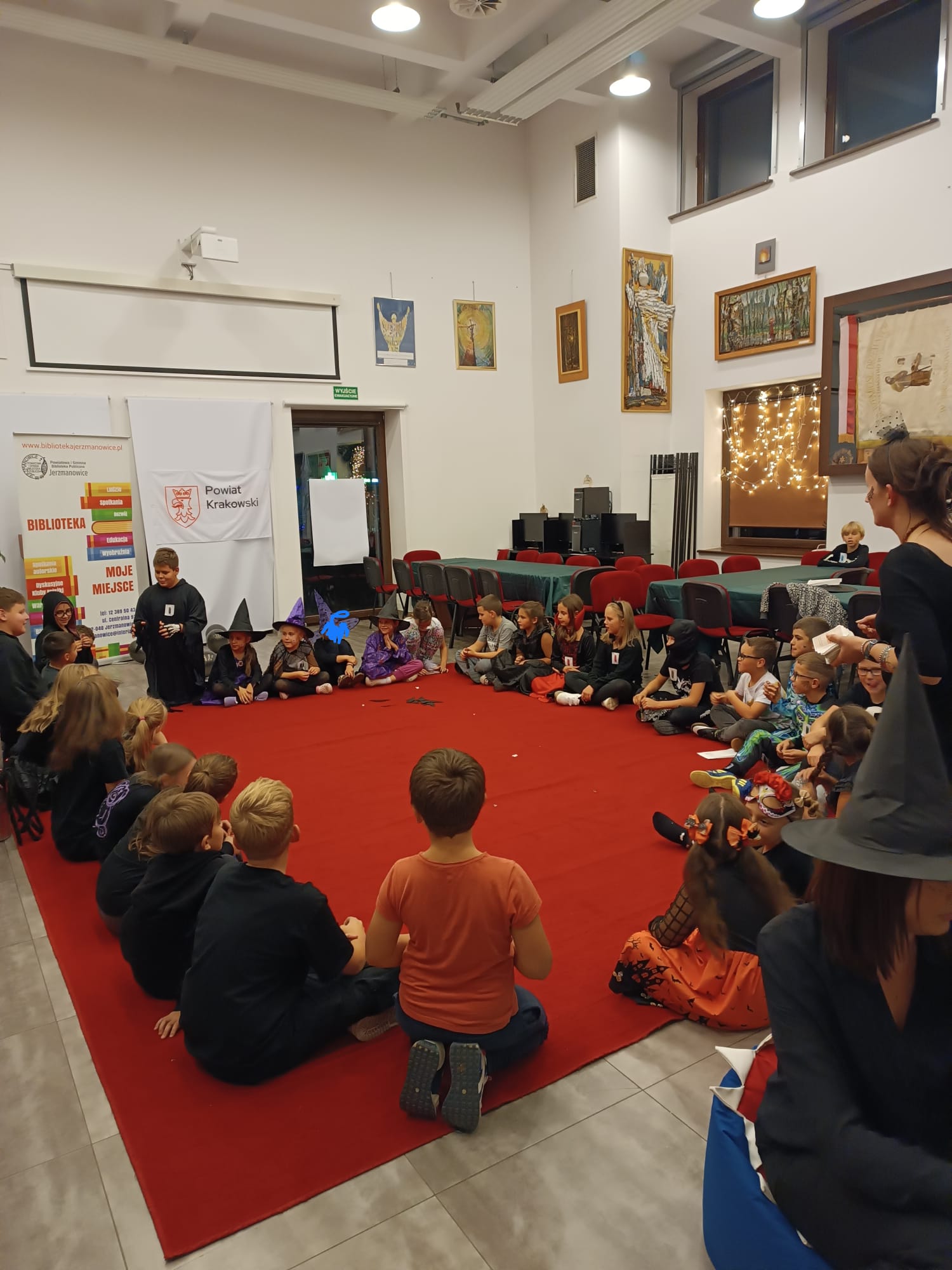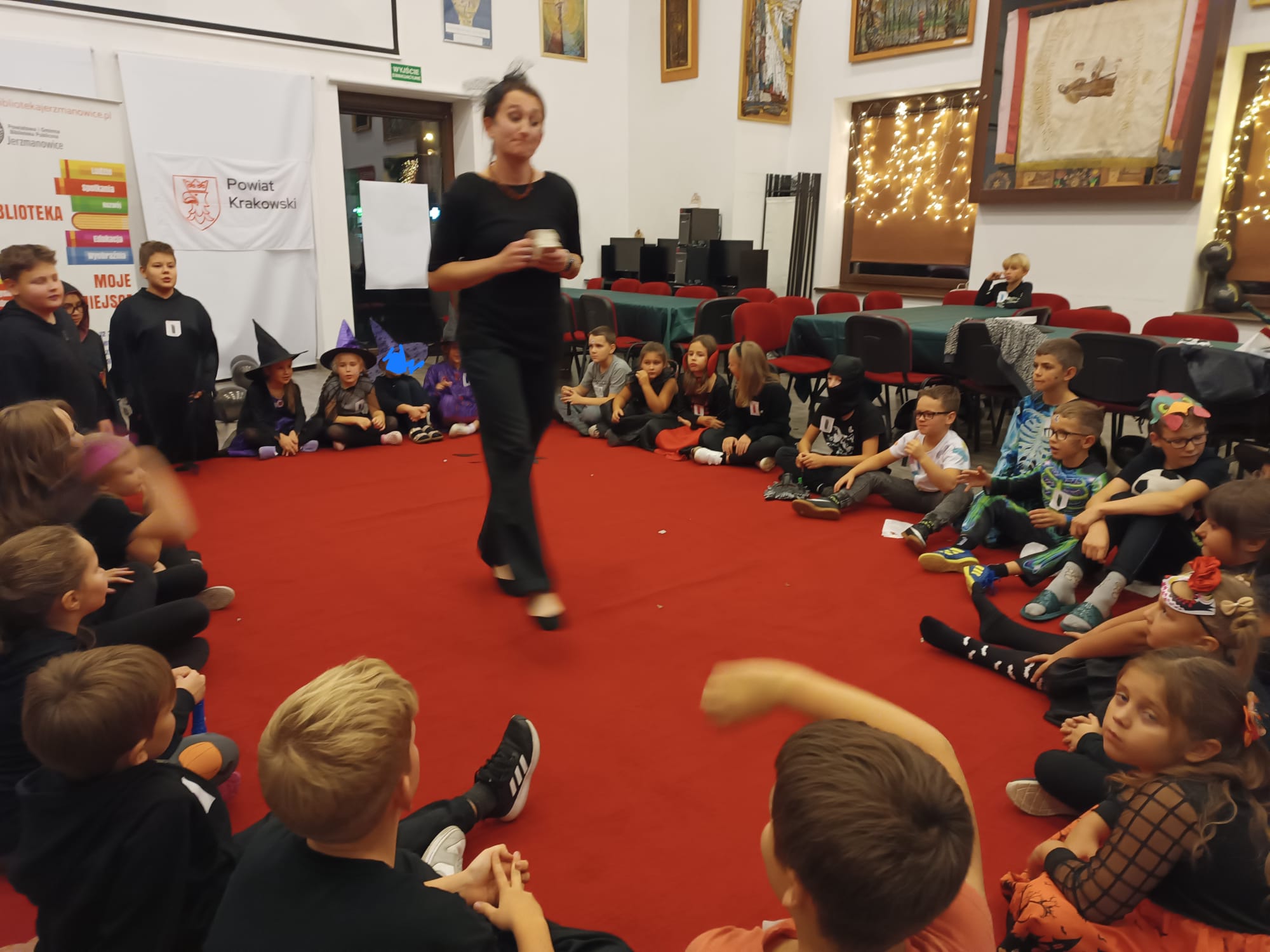 Nasze tegoroczne wydarzenie w Bibliotece Głównej w Jerzmanowicach zaczęliśmy świetną zabawą przy poszukiwaniu nietoperzy na terenie całego budynku. Dzieci w 6 grupach miały za zadanie znaleźć jak najwięcej papierowych zwierzątek - będących znakiem rozpoznawczym naszej gminy - przyklejonych w różnych zaskakujących miejscach. Spostrzegawczość była tym cenniejsza, że w budynku było ciemno, a uczestnicy byli wyposażeni jedynie w latarki. Po skończonej zabawie przeliczyliśmy znalezione nietoperze, a 3 najlepsze grupy dostały nagrody.
