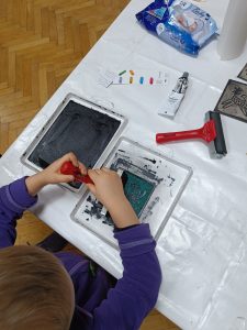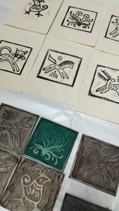 Chętni uczestnicy mieli również okazję własnoręczne wykonać odbitki linorytów inspirowanych łysogórskimi kafelkami, które ozdabiają bocheńską bibliotekę.