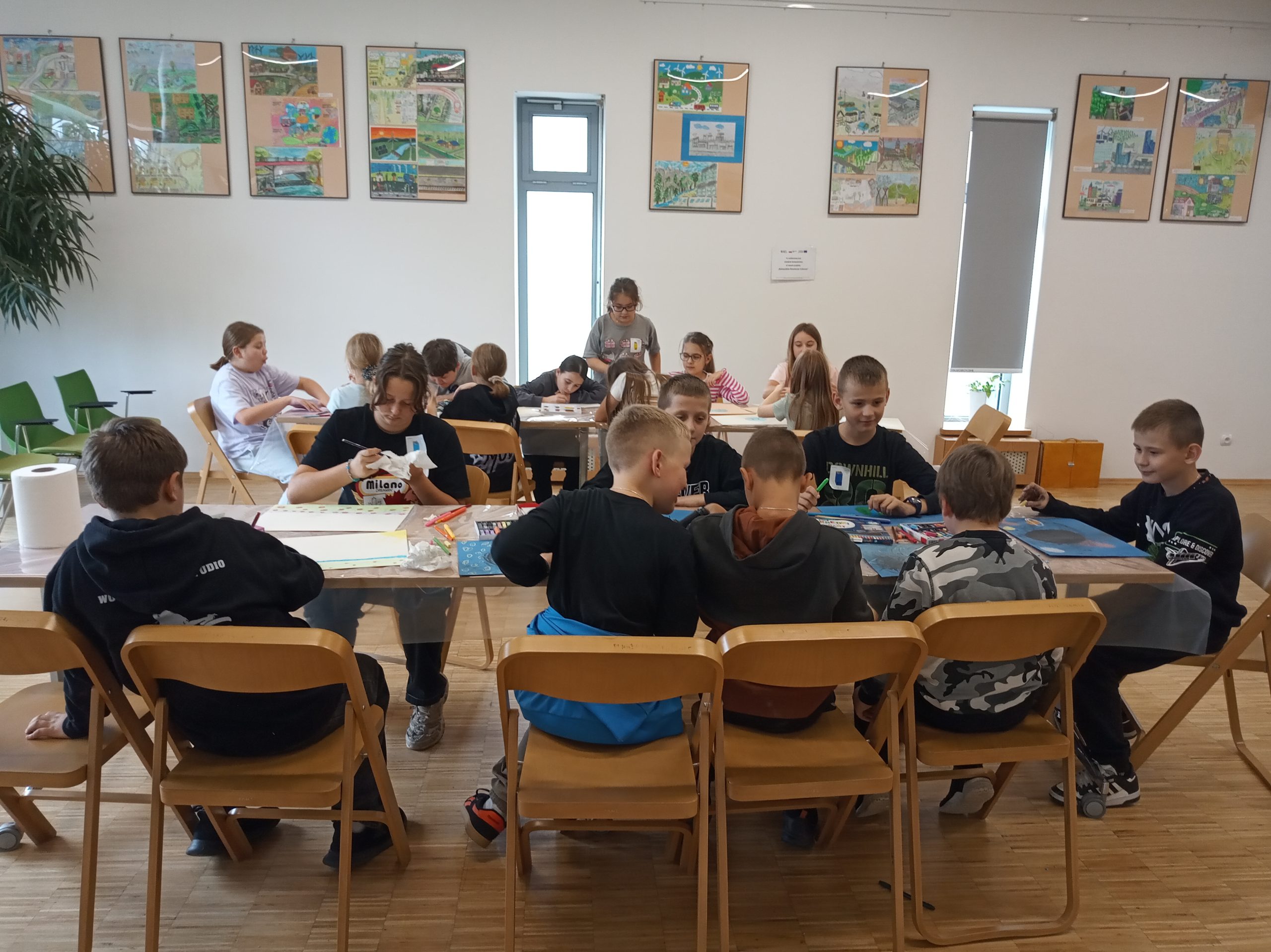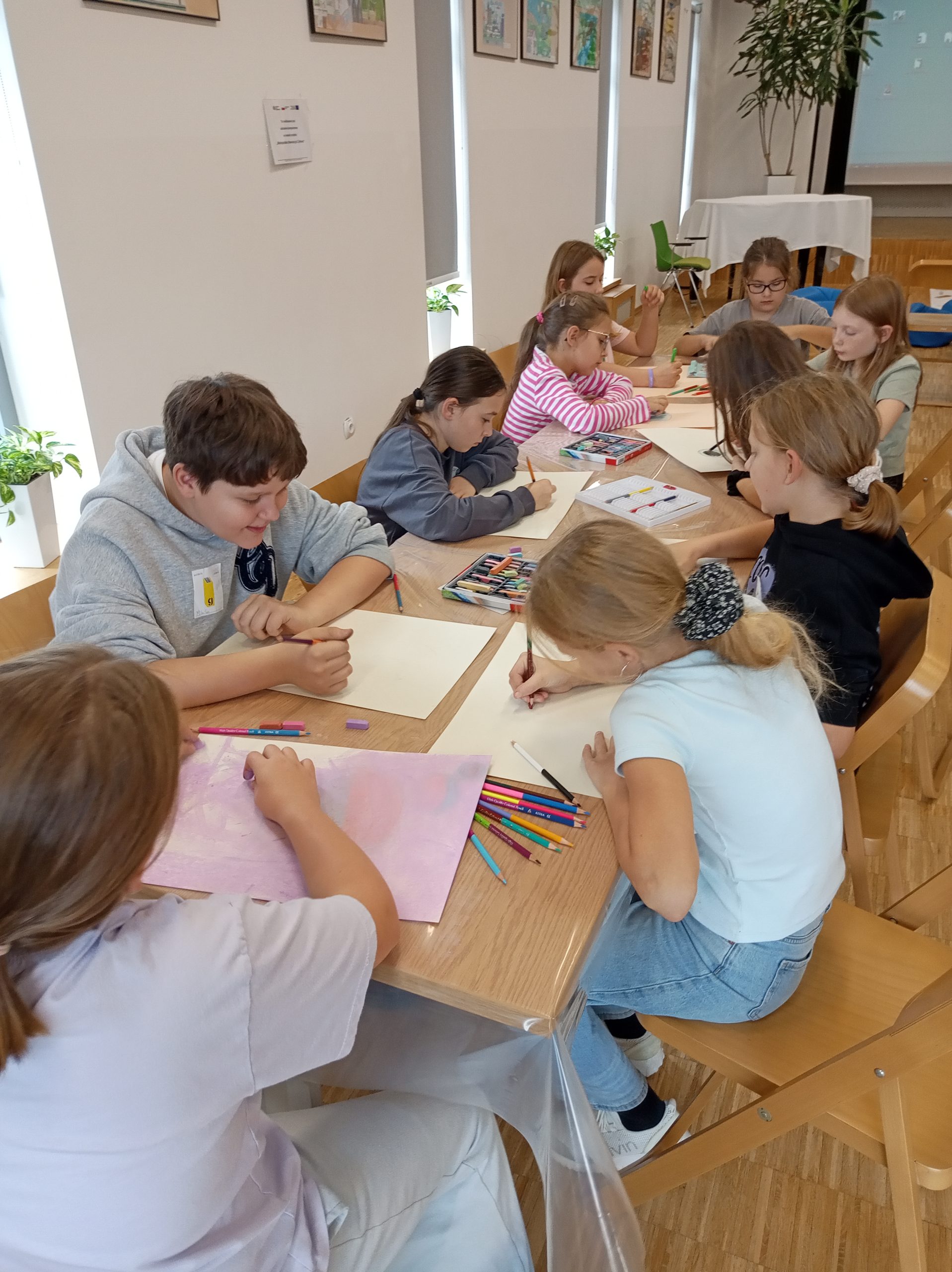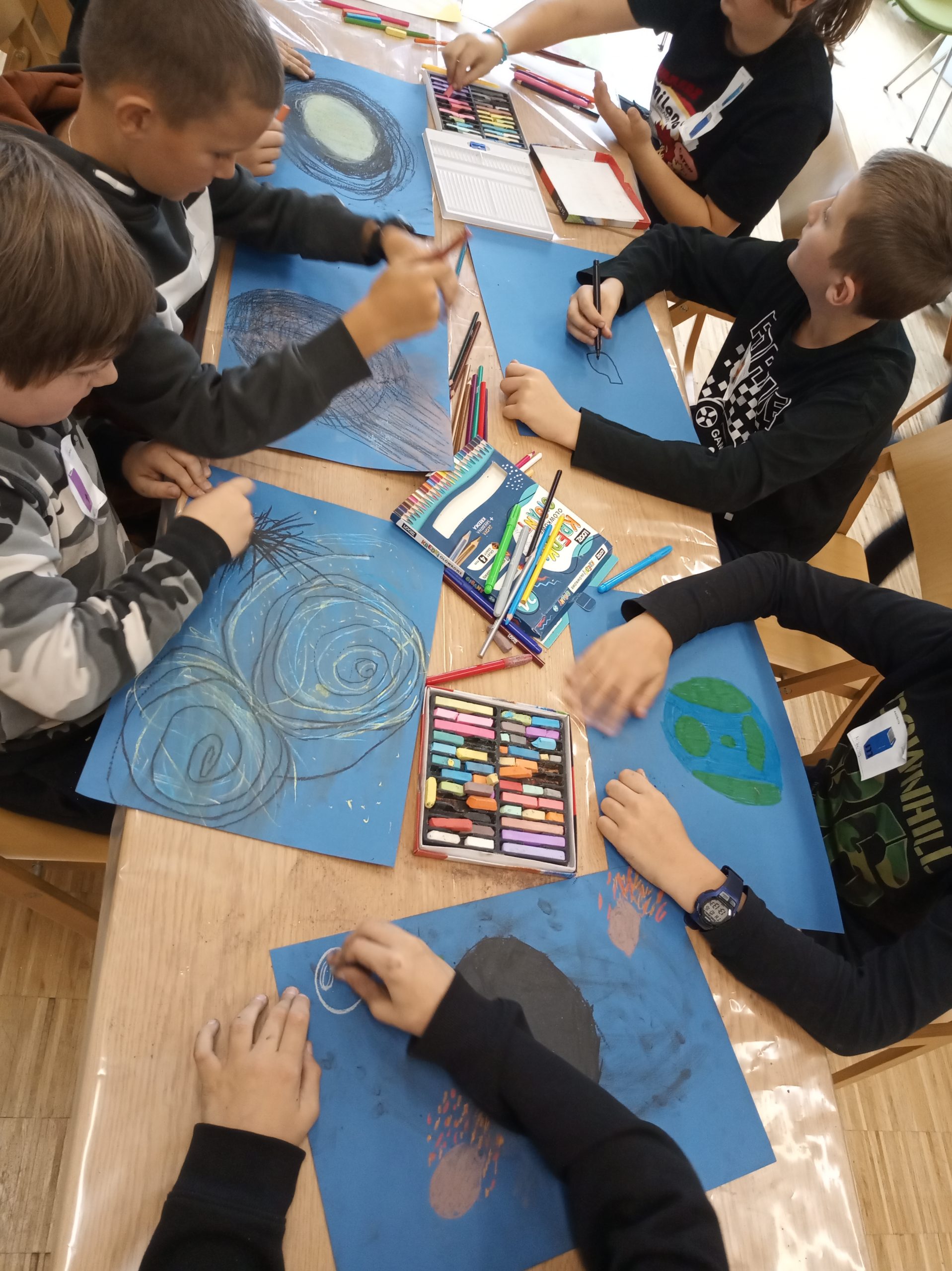 Następnym punktem było czytanie teatrzyku kamishibai oraz związane z nim warsztaty plastyczne. Dzieci wykorzystując technikę suchych pasteli stworzyły swoje dzieła.