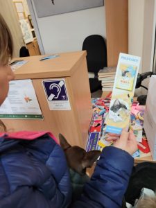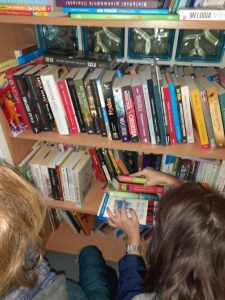 Wszyscy, którzy nas odwiedzili, chętnie brali udział w zabawie. Każdą poprawną odpowiedź nagradzaliśmy książkami wybieranymi przez uczestników quizu, a także pięknymi kolorowymi zakładkami. Najmłodsi uczestnicy Nocy Bibliotek z ogromną radością wybierali z wielkiego stosu zakładki z pieskami i kotkami. Zabawa była nad wyraz udana – świadczył o tym prawie pusty regał z książkami. Bardzo się cieszymy, że wręczyliśmy aż tak dużo książek!