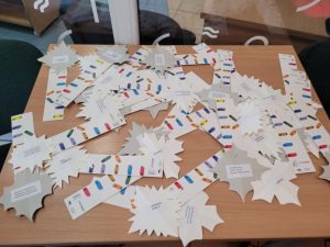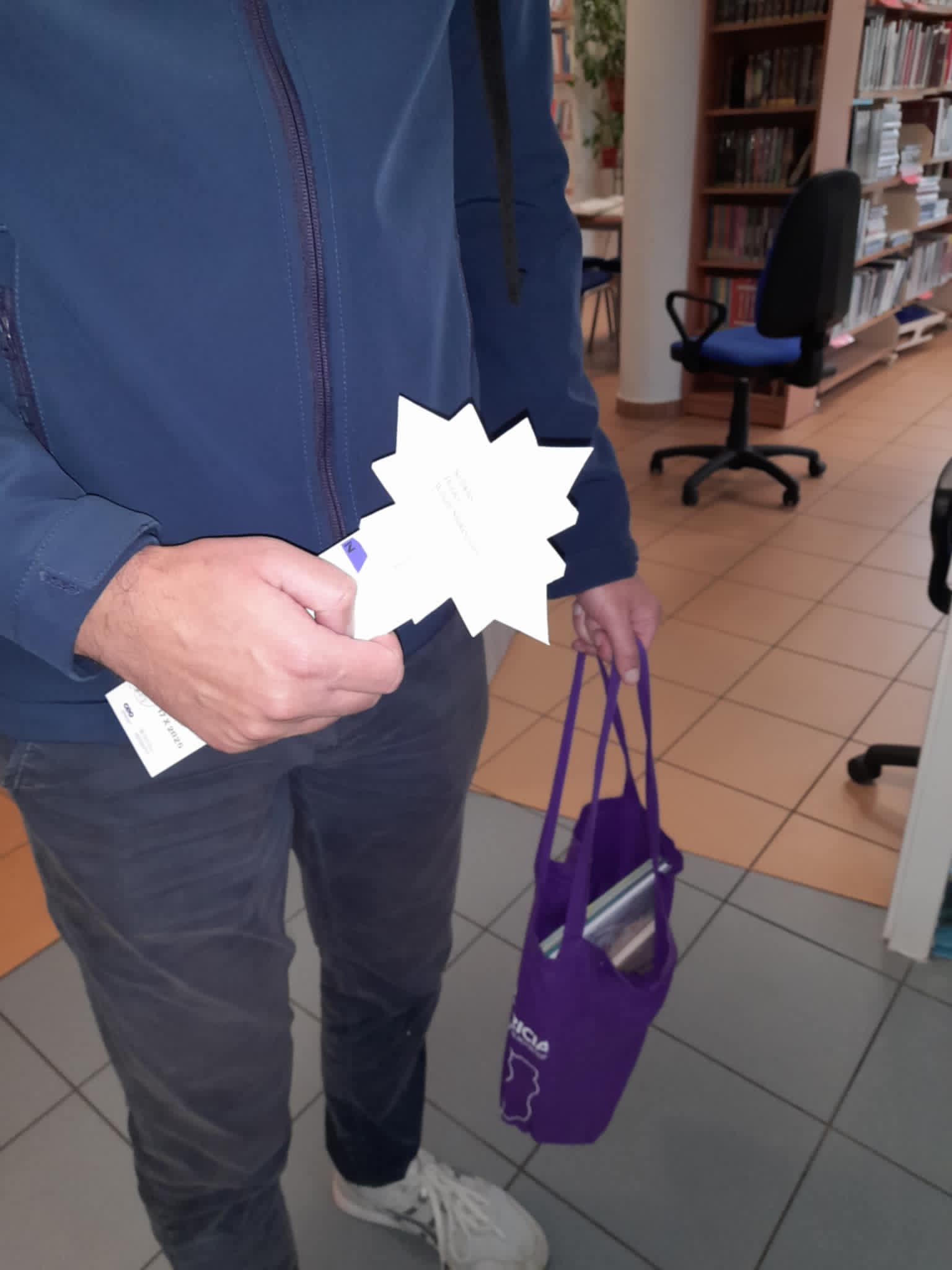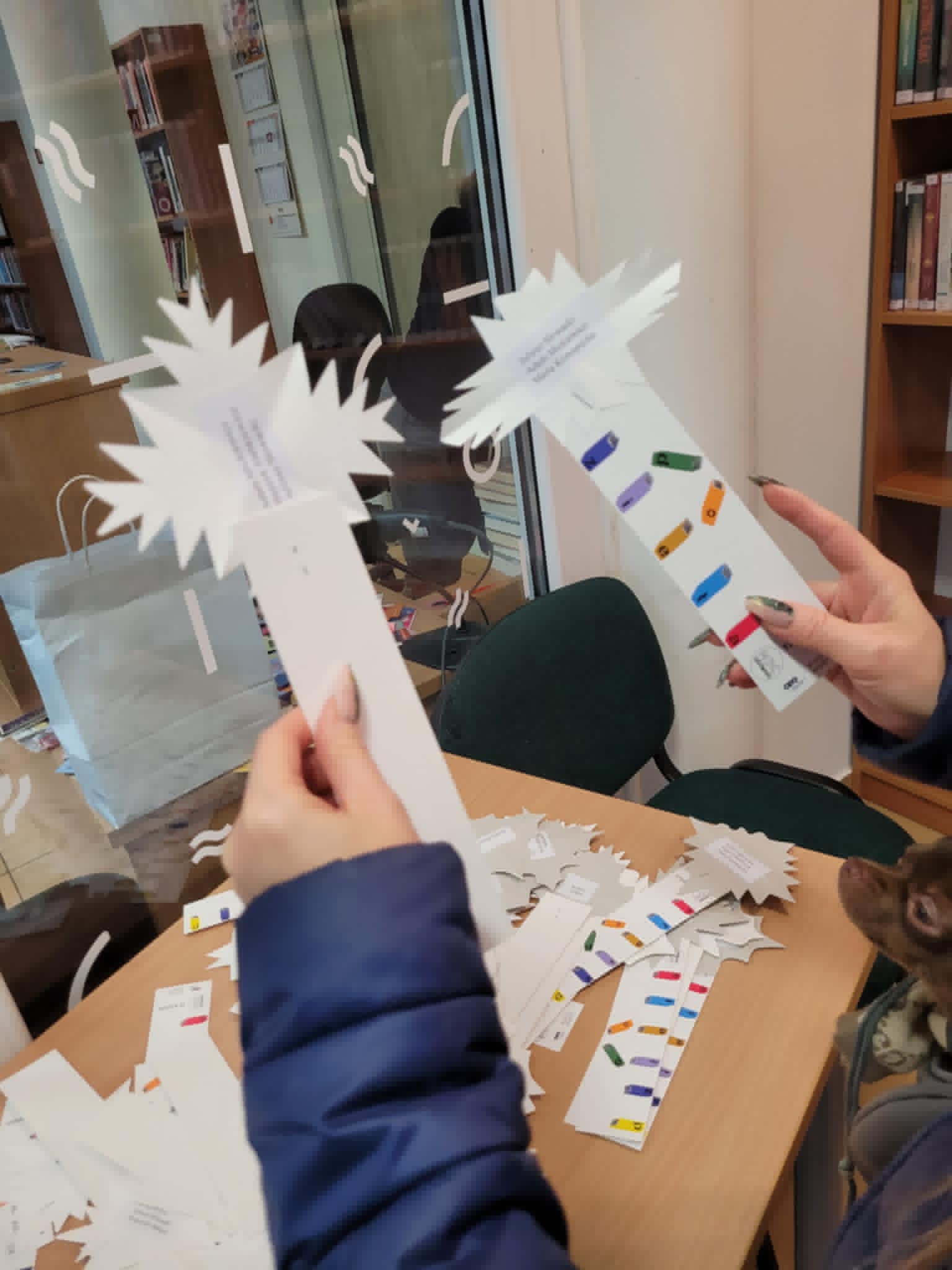 Przybyłych do biblioteki powitały – błyszczące jak zawsze nocą – złote gwiazdki przyczepione do sufitu. Na stoliku leżały zakładki z gwiazdkami, na których z jednej strony były wypisane tytuły różnych dzieł literackich, a z drugiej strony – trzy nazwiska autorów dzieł, w tym również tego, który napisał dzieło wymienione na zakładce.
