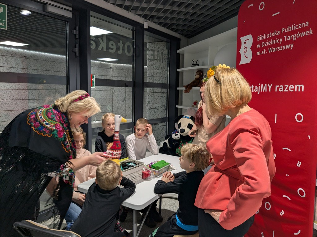 Zanim rozpoczęła się inauguracja ogólnopolskiej Nocy Bibliotek w Metrotece, kosmiczną przestrzeń wypełniły dzieci. Rozbrzmiało radosne „Do dzieła!” (hasło tegorocznej Nocy) i… bibliotekarki stały się góralkami! Towarzyszyła im maskotka – gęś w stroju góralskim. Podczas rodzinnych warsztatów literacko-plastycznych nasza cudowna wolontariuszka, Pani Małgosia przeczytała fragment książki Marcina Przewoźniaka pt. „Gęś Gągolina i latający tramwaj”, a następnie wykonaliśmy zabawkowe gąski.
