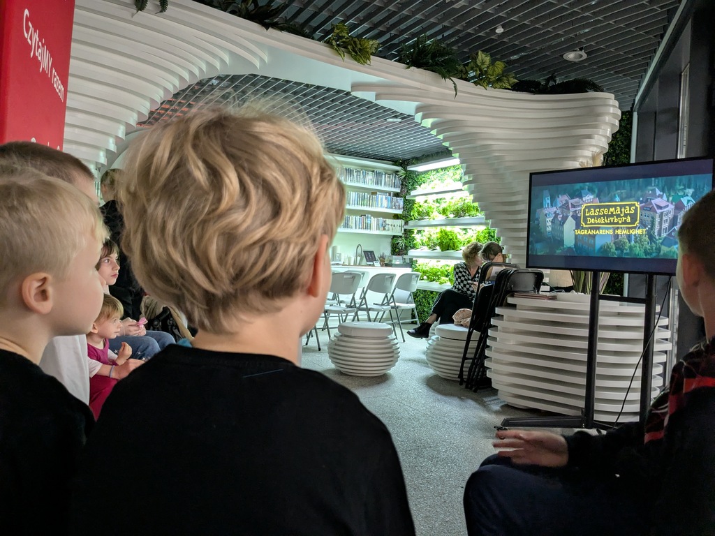 Potem zgasiliśmy światła i… Metroteka przemieniła się w salę kinową! Dzieci obejrzały film „Biuro Detektywistyczne Lassego i Mai. Rabuś z pociągu”. Film został udostępniony dzięki partnerowi Nocy Bibliotek – Festiwalowi Filmowemu TAURON Młode Horyzonty.